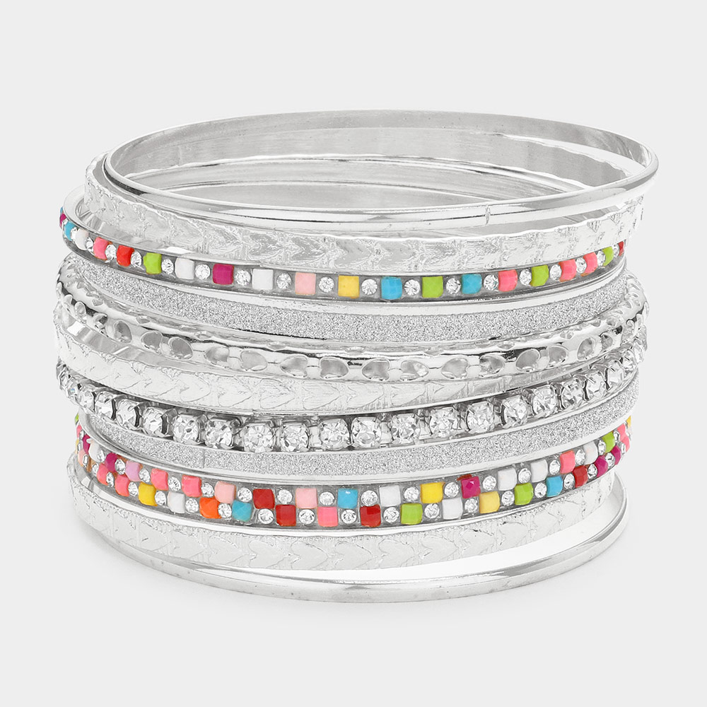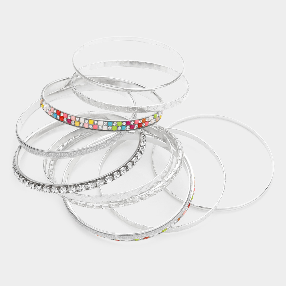11PCS - Stackable Stone Embellished Metal Bangle Bracelets
