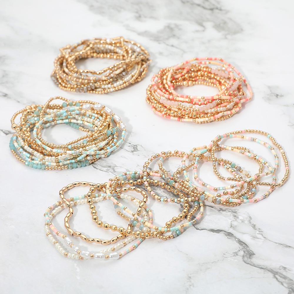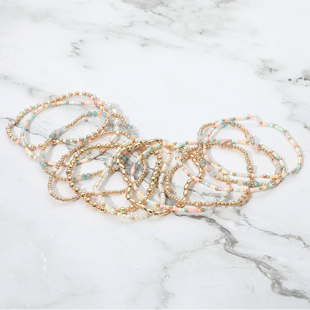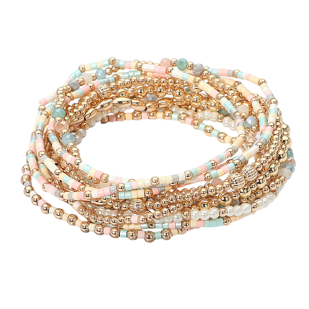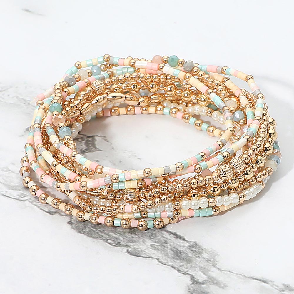 12PCS - Pearl Metal Ball Seed Faceted Beaded Stretch Multi Layered Bracelets