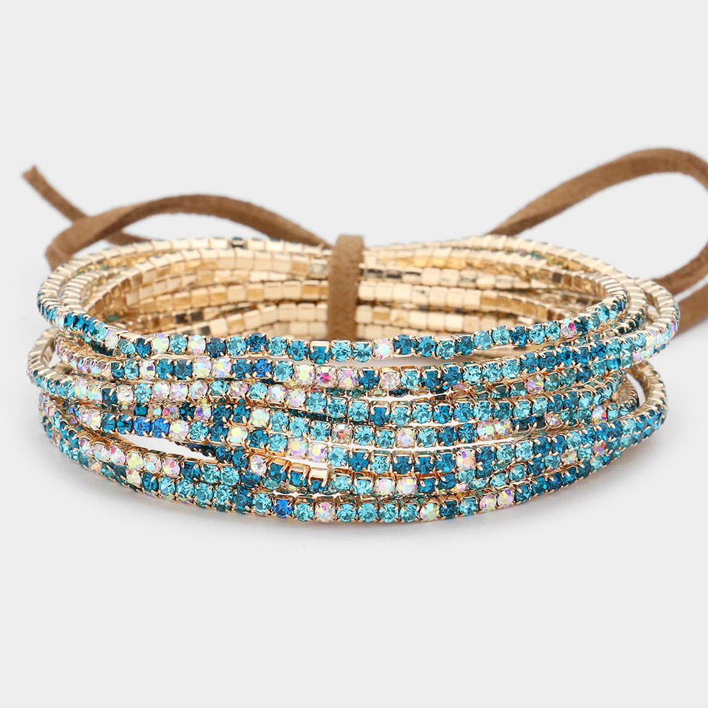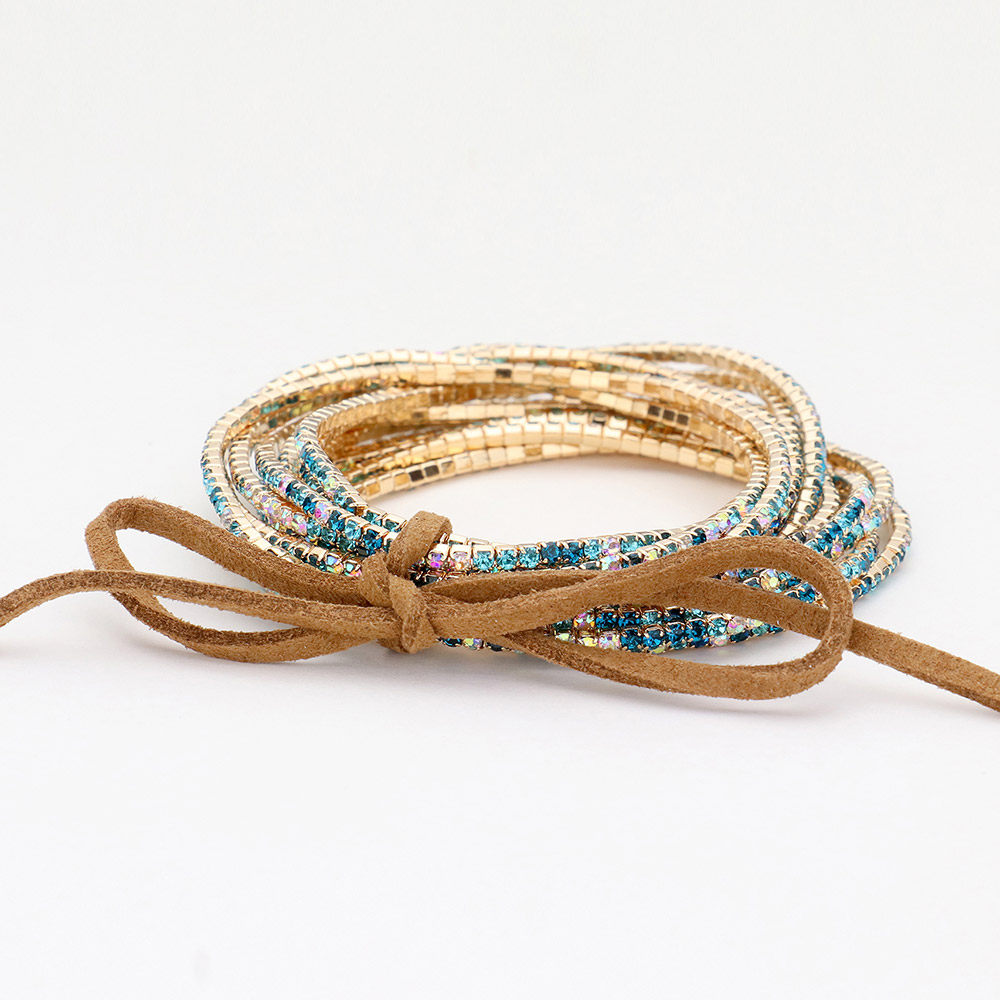 • Colorful wrap bracelet featuring multiple strands with shimmering bead accents and an adjustable tie closure. A playful accessory perfect for casual and festive looks.