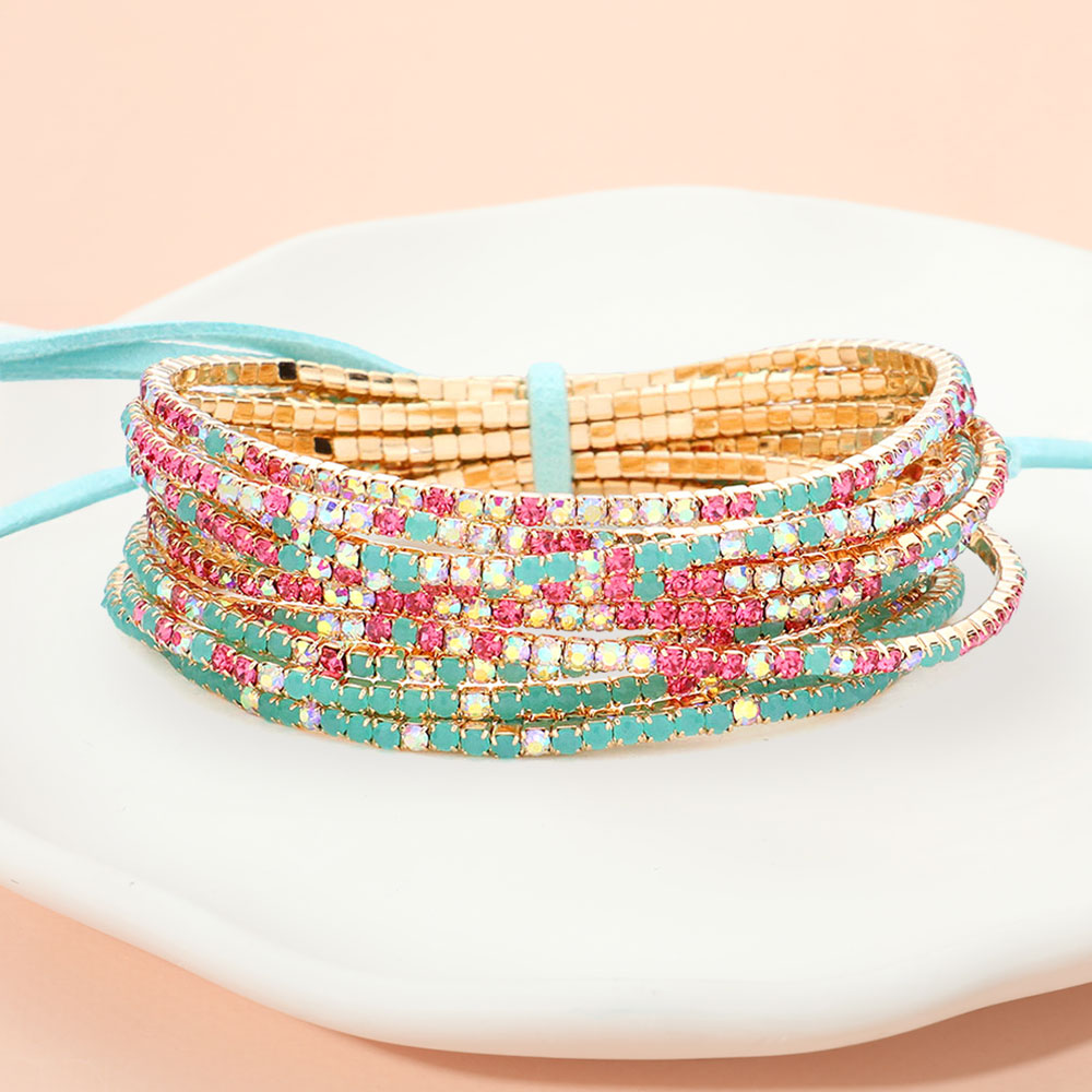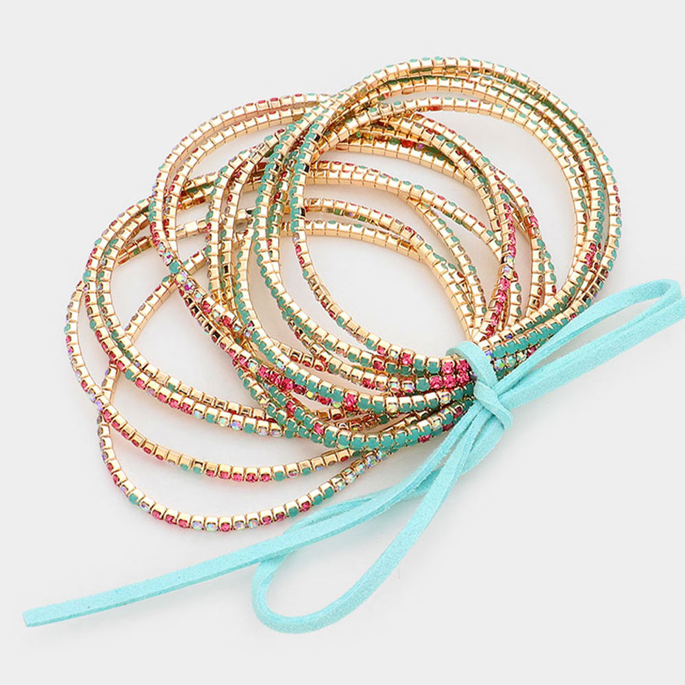 12PCS - Ribbon Pearl Rhinestone Layered Stretch Bracelets