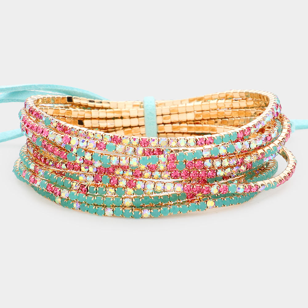 • Colorful wrap bracelet featuring multiple strands with shimmering bead accents and an adjustable tie closure. A playful accessory perfect for casual and festive looks.