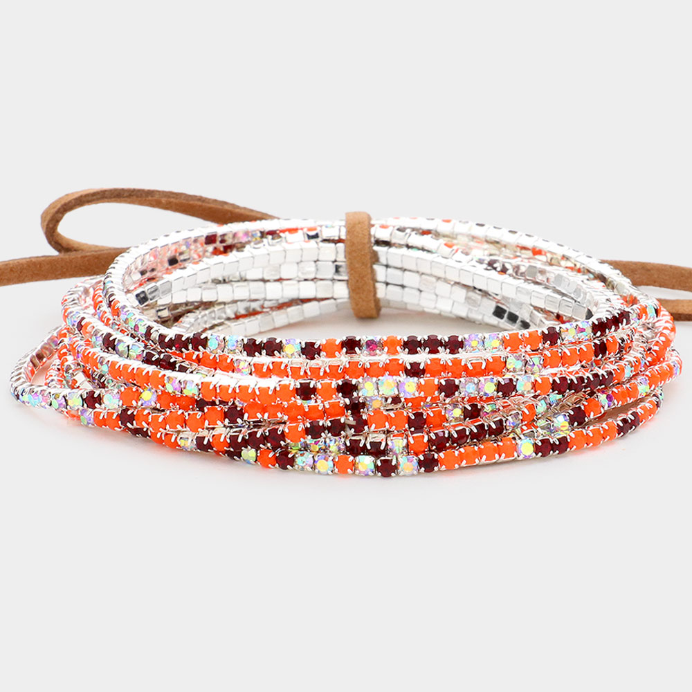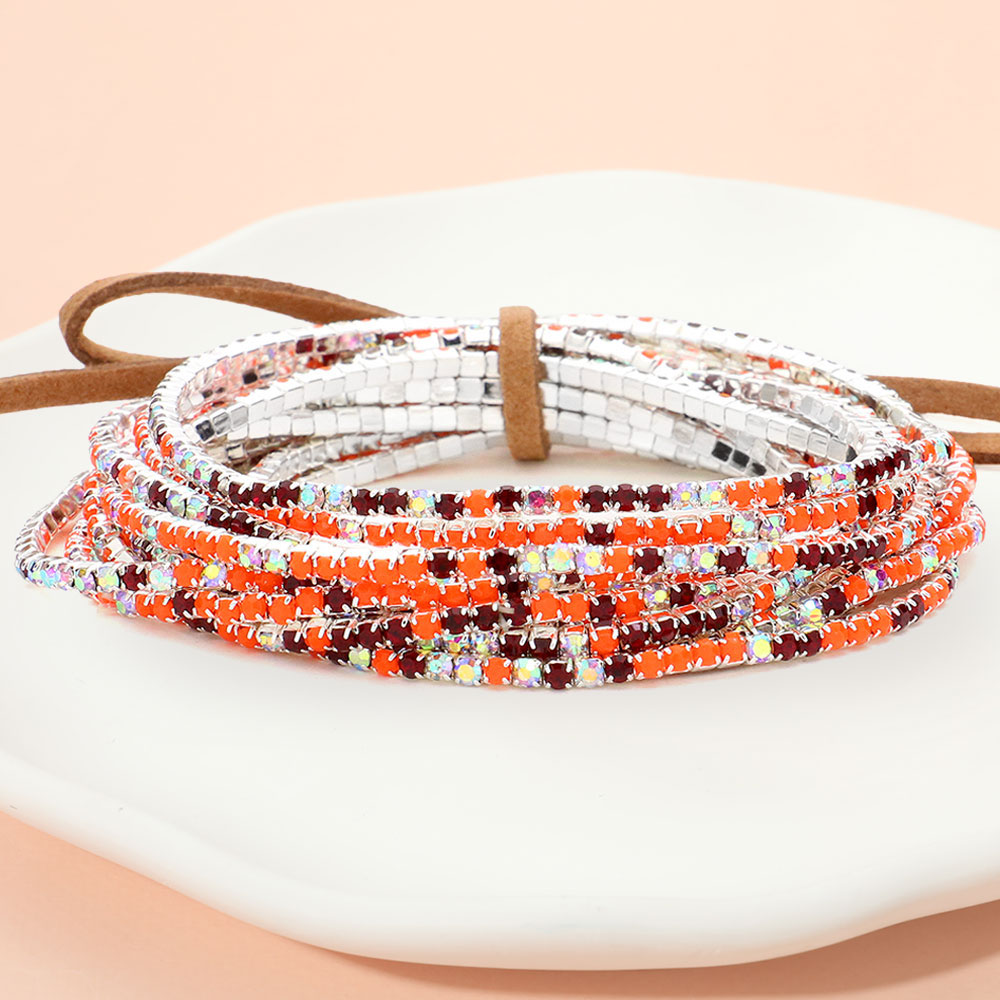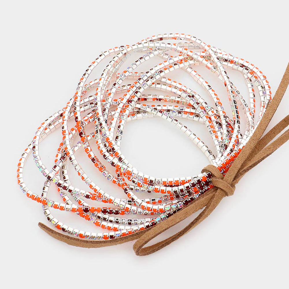 • Colorful wrap bracelet featuring multiple strands with shimmering bead accents and an adjustable tie closure. A playful accessory perfect for casual and festive looks.