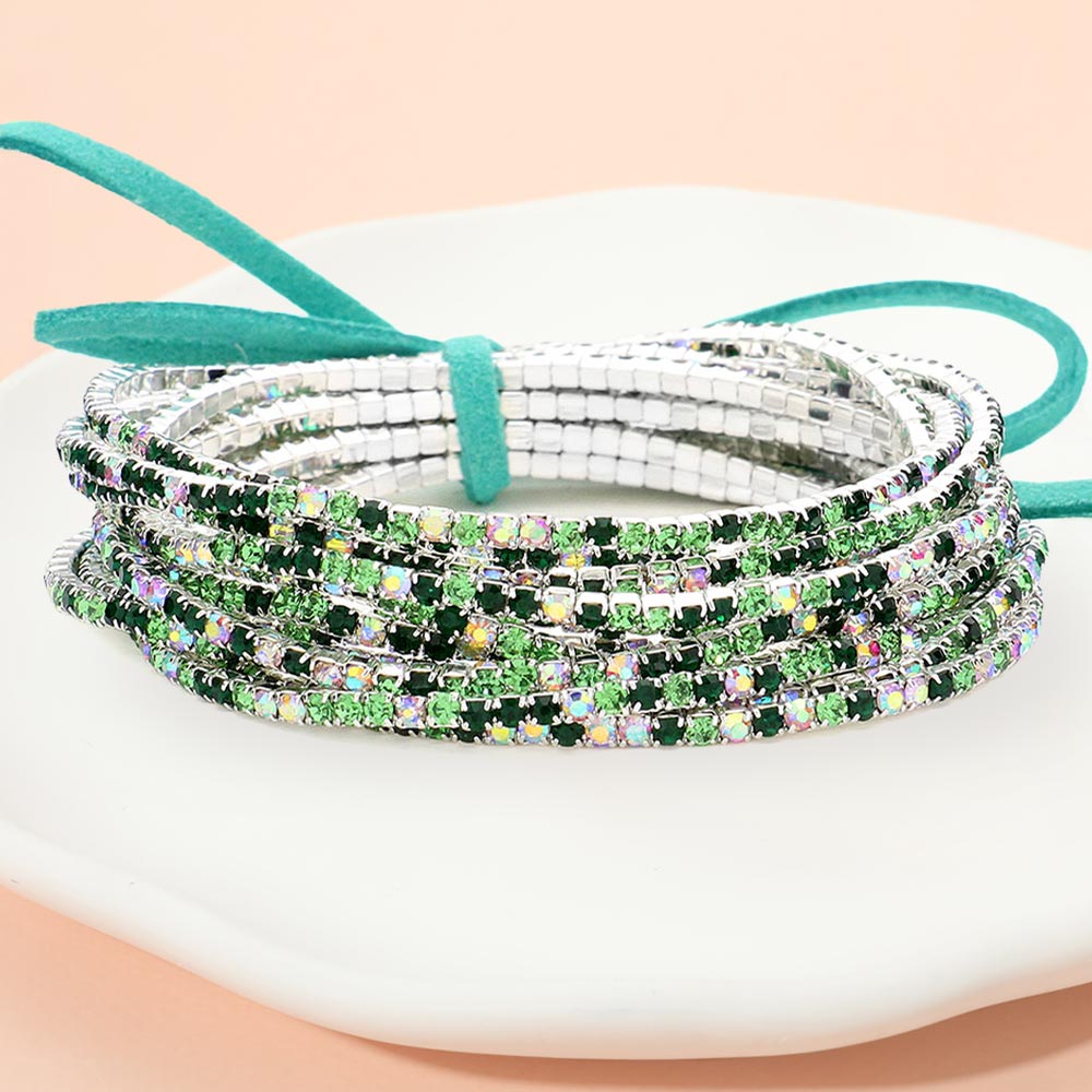 12PCS - Ribbon Colorful Rhinestone Layered Stretch Bracelets