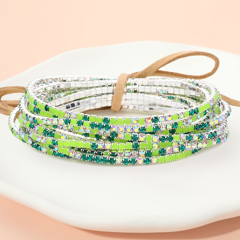 • Colorful wrap bracelet featuring multiple strands with shimmering bead accents and an adjustable tie closure. A playful accessory perfect for casual and festive looks.
