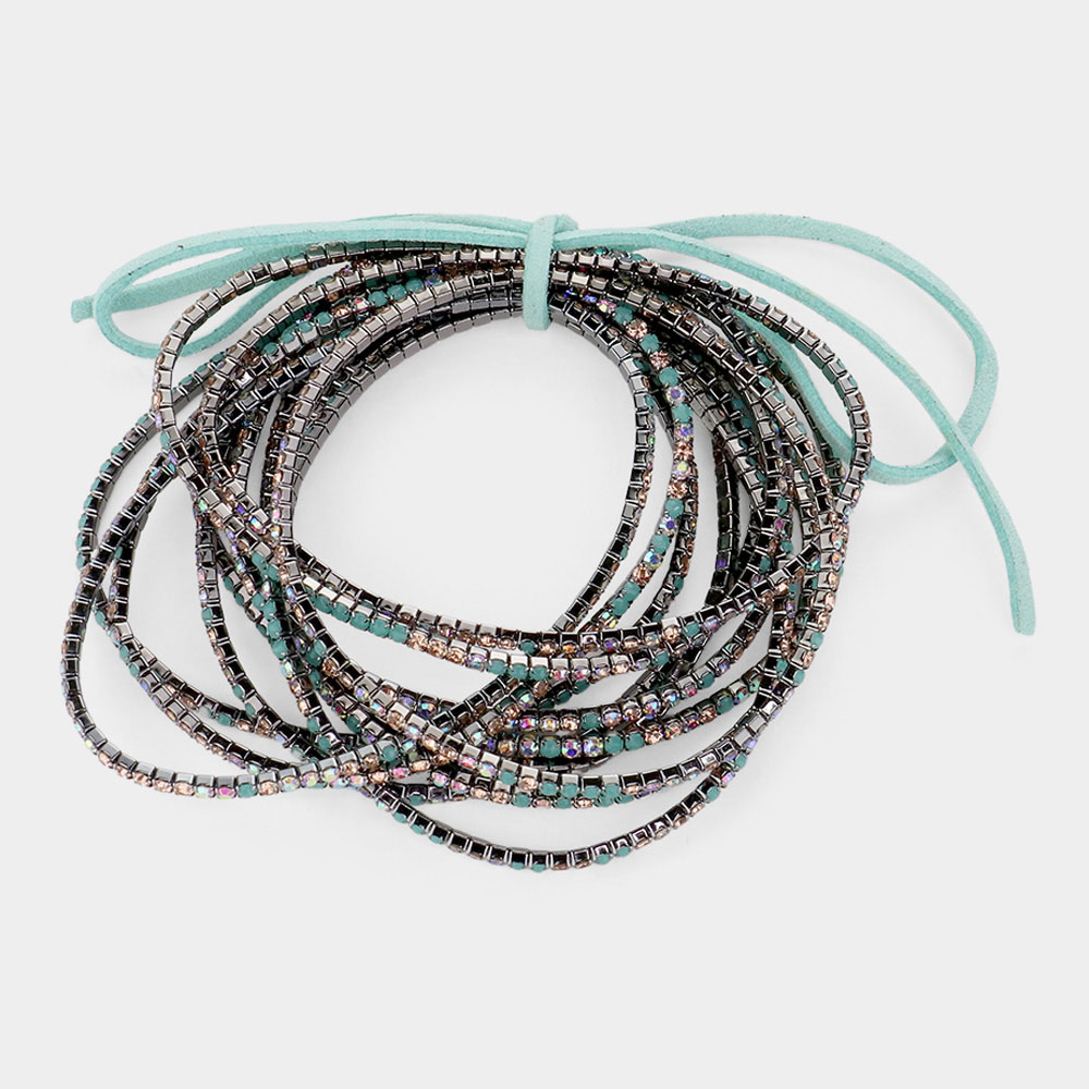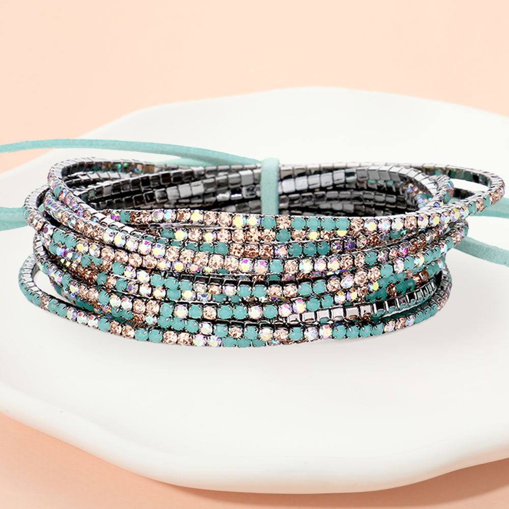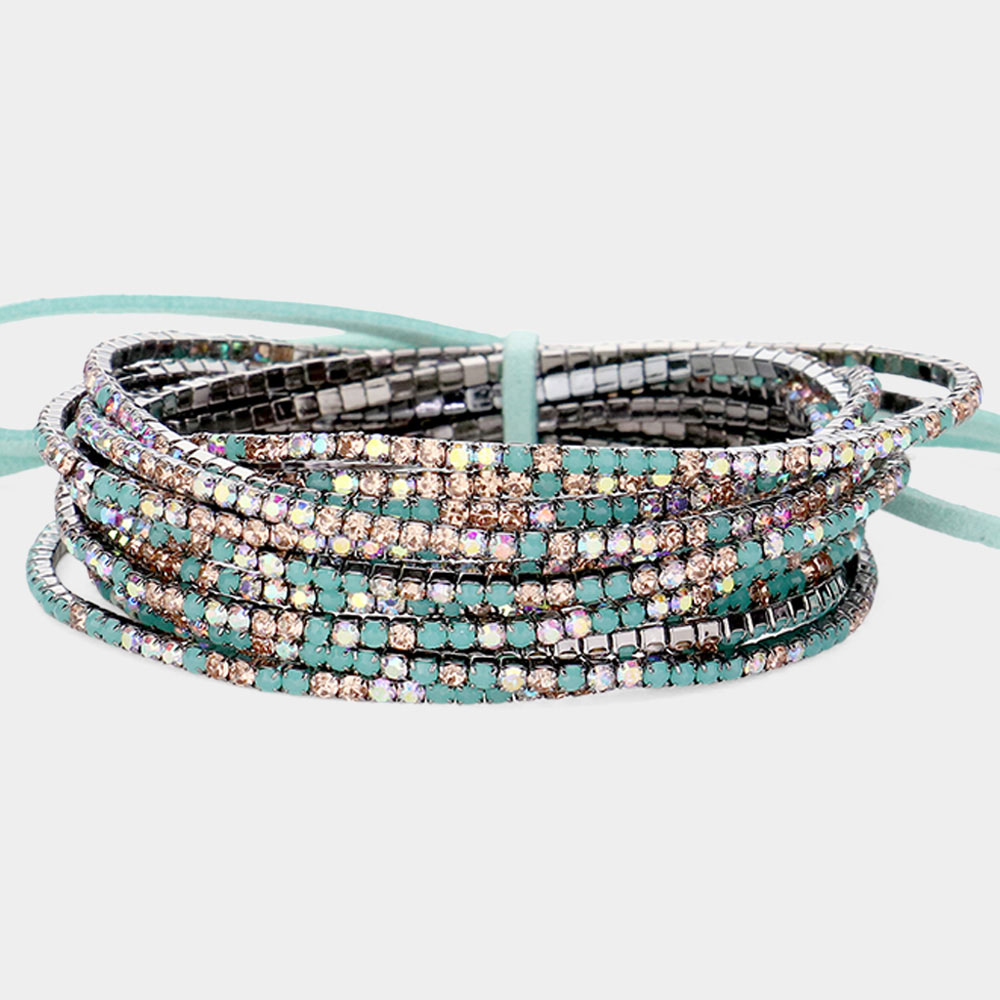 12PCS - Ribbon Colorful Rhinestone Layered Stretch Bracelets