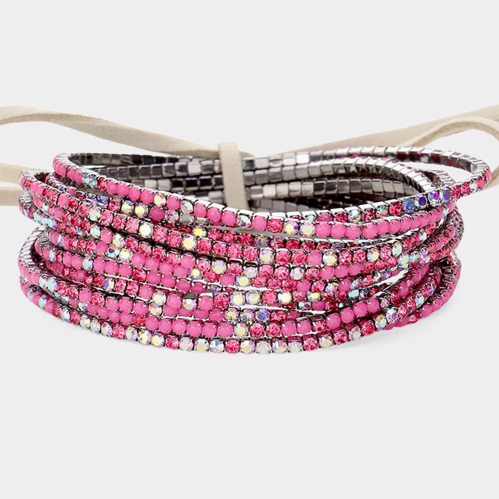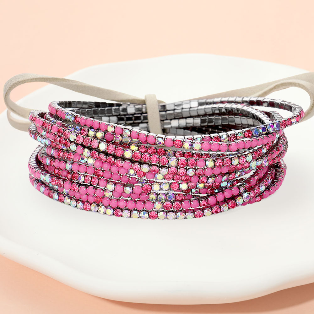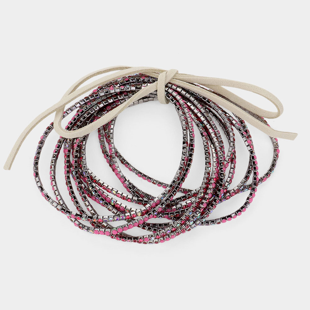 12PCS - Ribbon Colorful Rhinestone Layered Stretch Bracelets