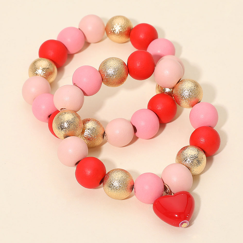 2PCS - Chunky Heart Charm Wooden Metal Ball Beaded Stretch Multi Layered Bracelets