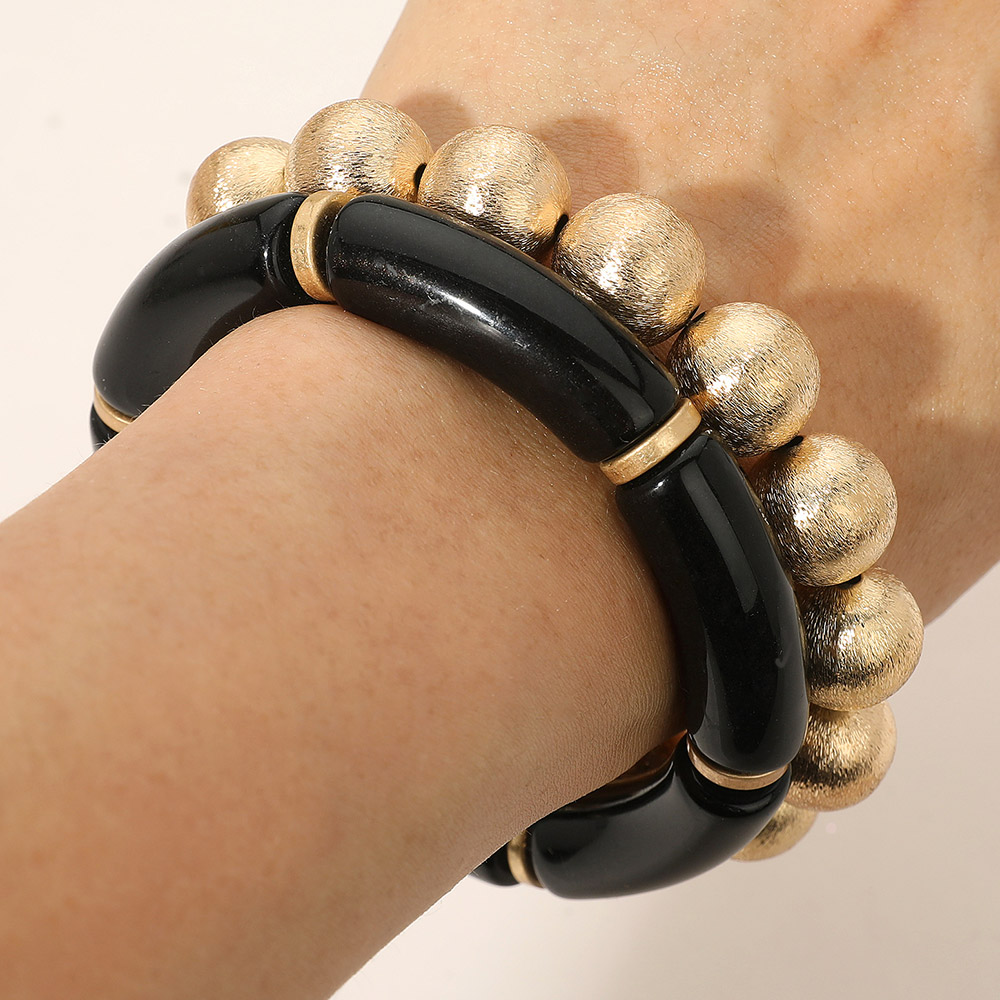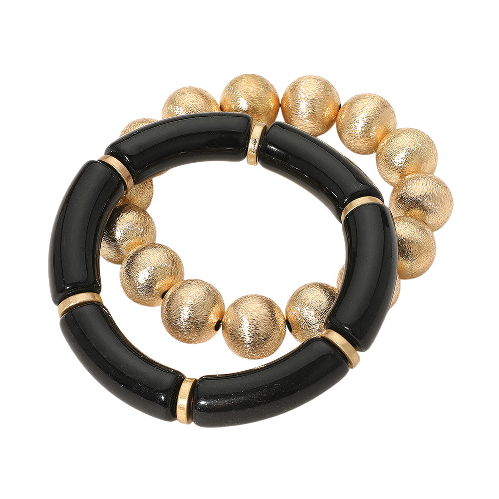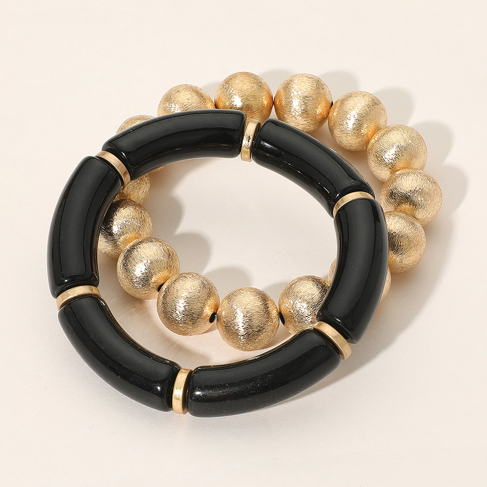 Details • Size : 1" H • Stretchable • Make a statement with this 2-piece bracelet set featuring bold curved tubes and textured round beads. Perfect for adding a modern, fashion-forward edge to your everyday or evening style. • Lead and Nickel Compliant