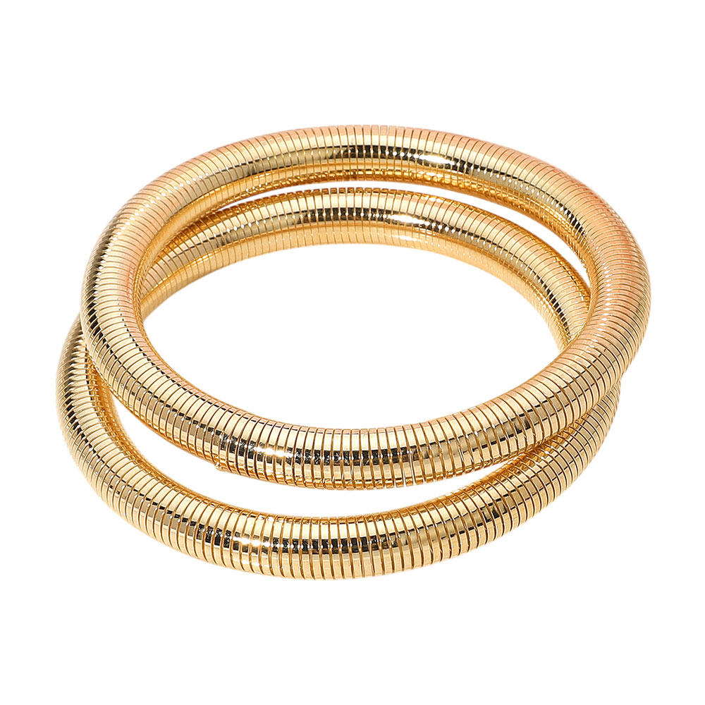 Details • Size : 0.7" H • Stretchable • This set of coiled bangle bracelets features a distinctive ribbed texture and flexible design, offering bold style with comfortable wear. Ideal for stacking or wearing solo, these bracelets add a modern, sculptural touch to both casual and elevated ensembles. • Lead and Nickel Compliant