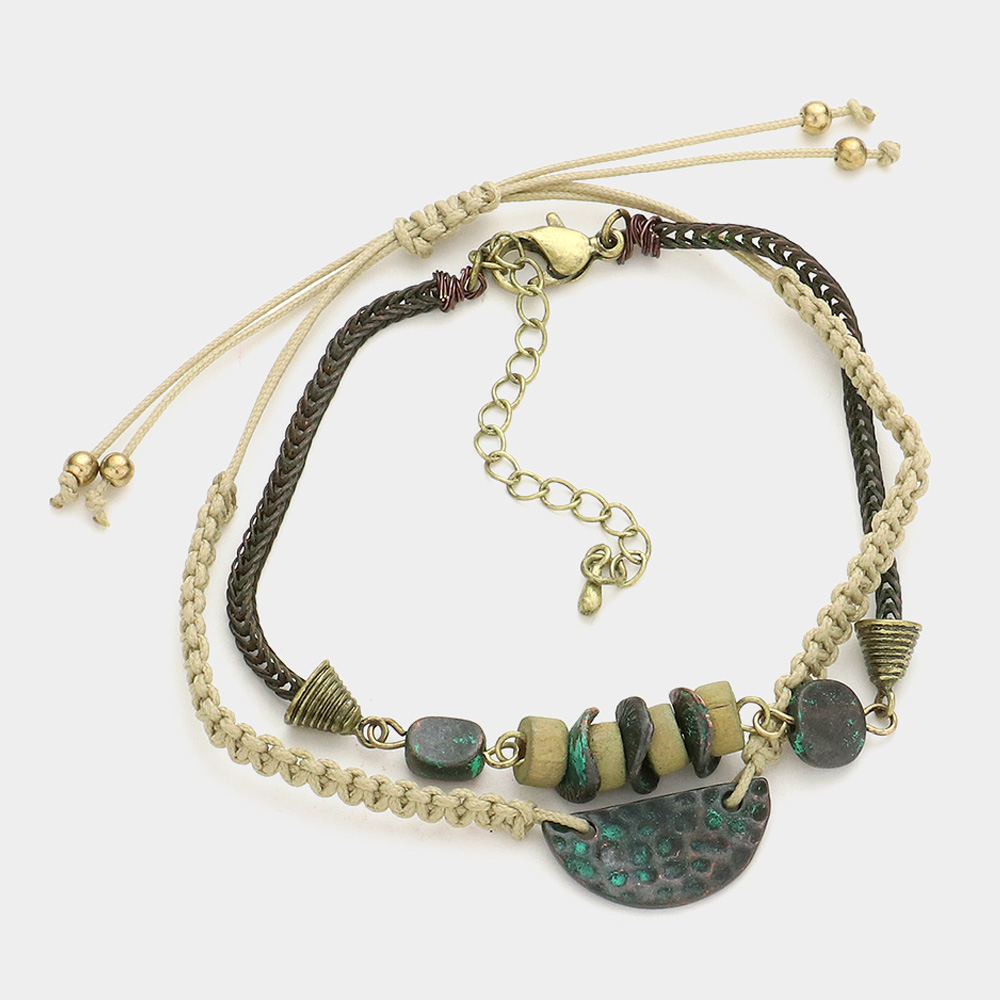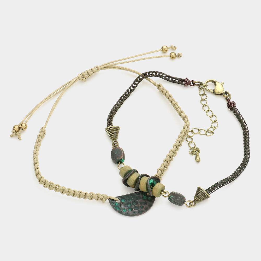 2PCS - Mixed Flat Wood Metal Faceted Beaded Stretch Multi Layered Bracelets