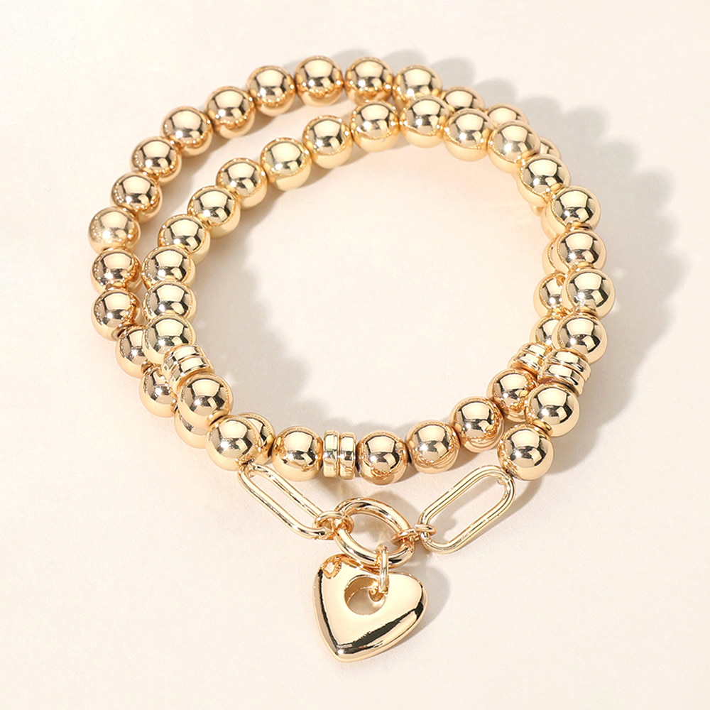 2PCS - Metal Heart Charm Pointed Ball Beaded Stretch Multi Layered Bracelets