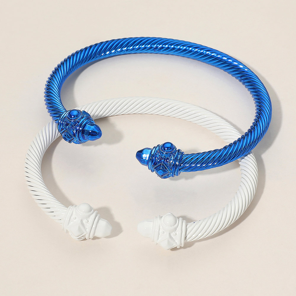 Details • Size : 0.6" H, 2.6" D • Cuff • Set of twisted cuff bangles featuring ornate end caps with sculpted detail. Open design allows flexible fit for various wrist sizes. Lightweight and bold, perfect for layering or wearing solo for a statement look. • Lead and Nickel Compliant