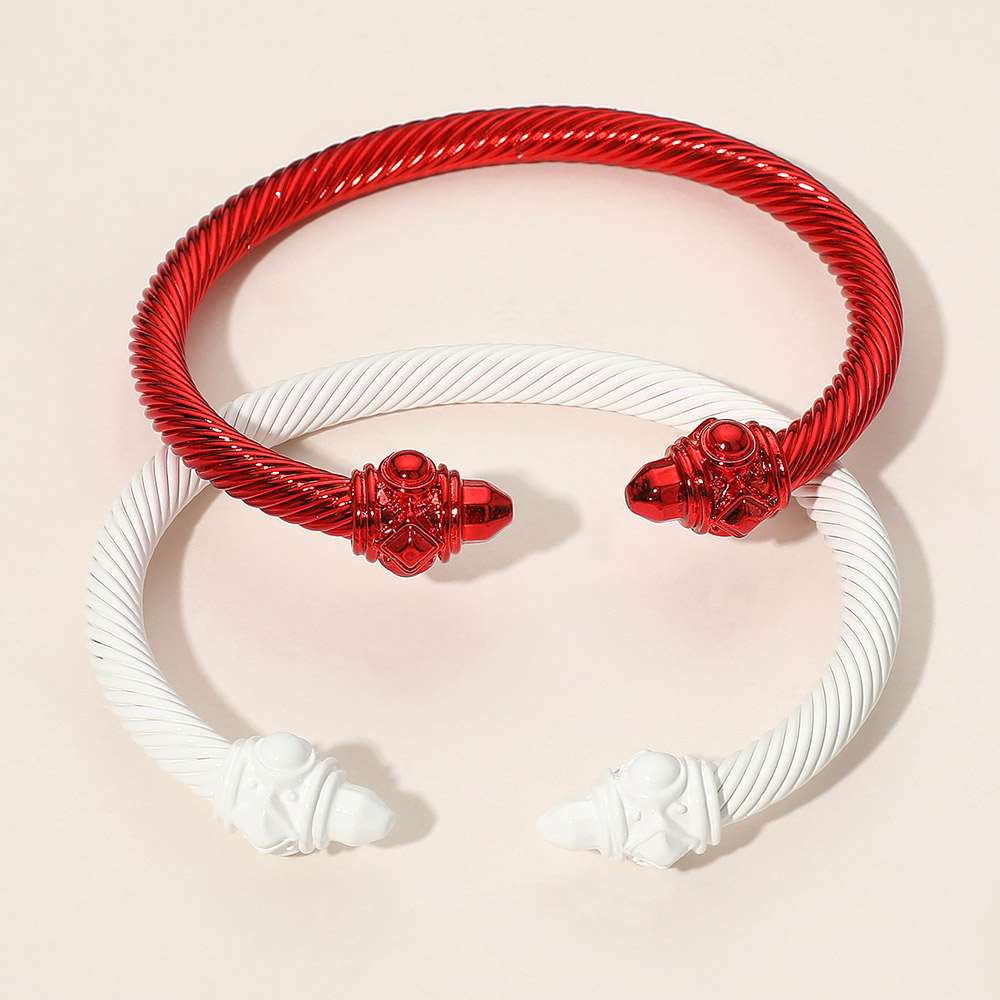 Details • Size : 0.6" H, 2.6" D • Cuff • Set of twisted cuff bangles featuring ornate end caps with sculpted detail. Open design allows flexible fit for various wrist sizes. Lightweight and bold, perfect for layering or wearing solo for a statement look. • Lead and Nickel Compliant