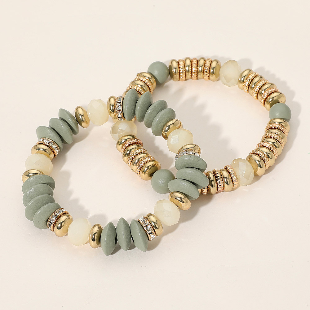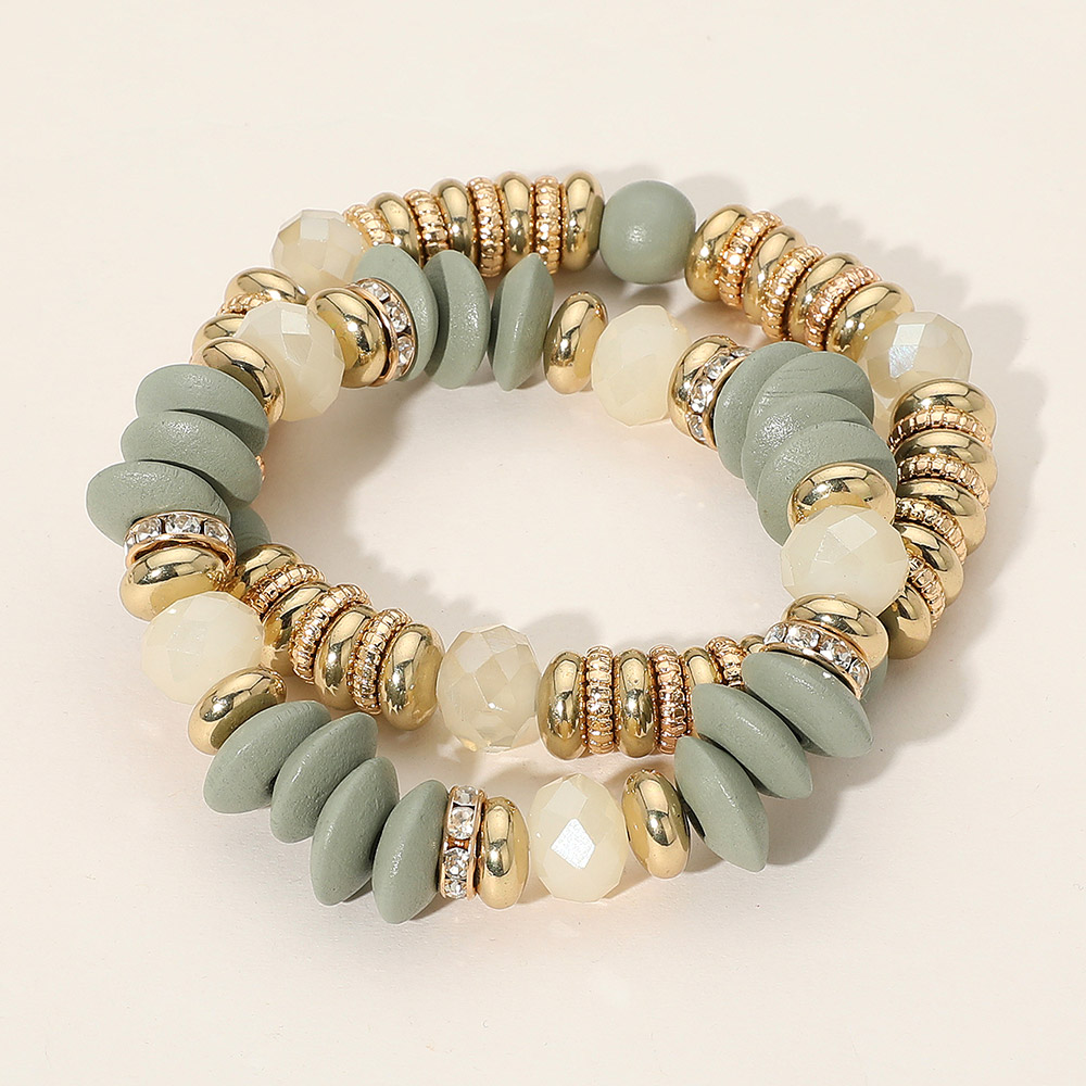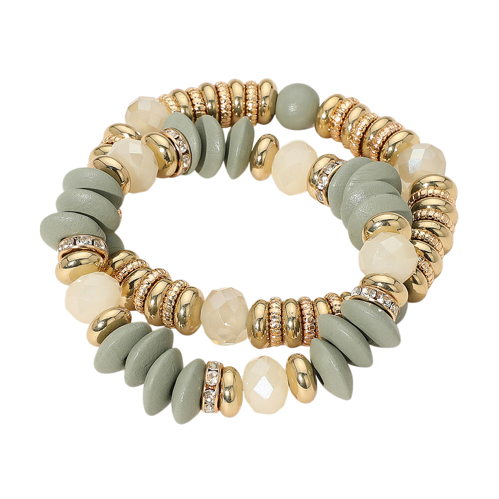 2PCS - Mixed Flat Wood Metal Faceted Beaded Stretch Multi Layered Bracelets