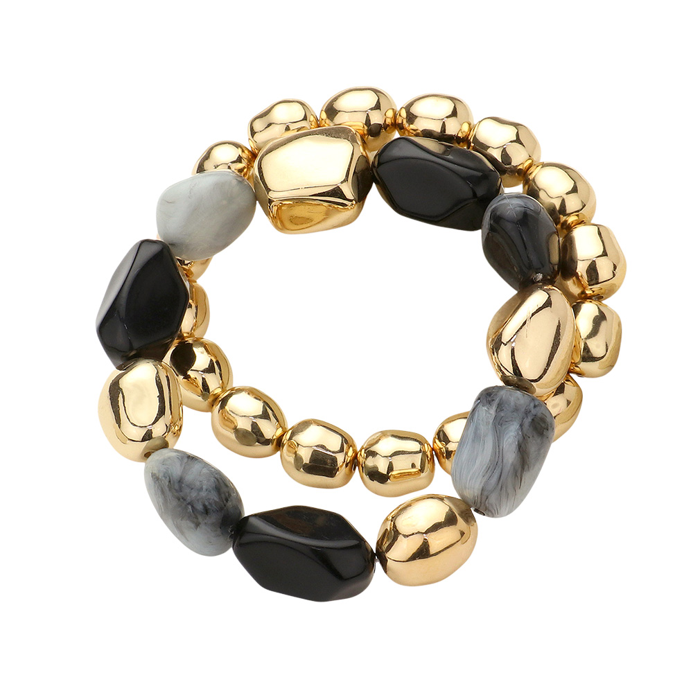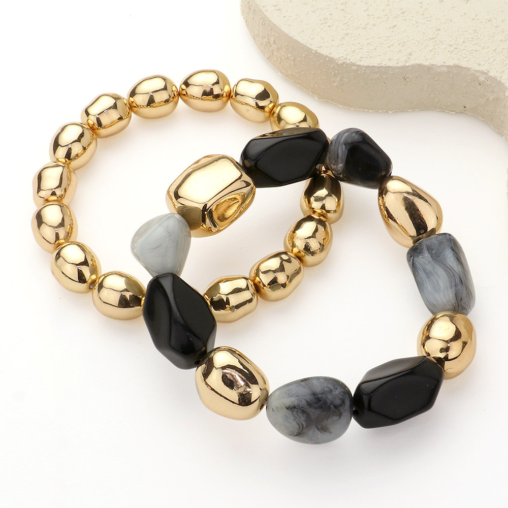 2PCS - Natural Pebble Stone Metal Ball Beaded Stretch Layered Bracelets