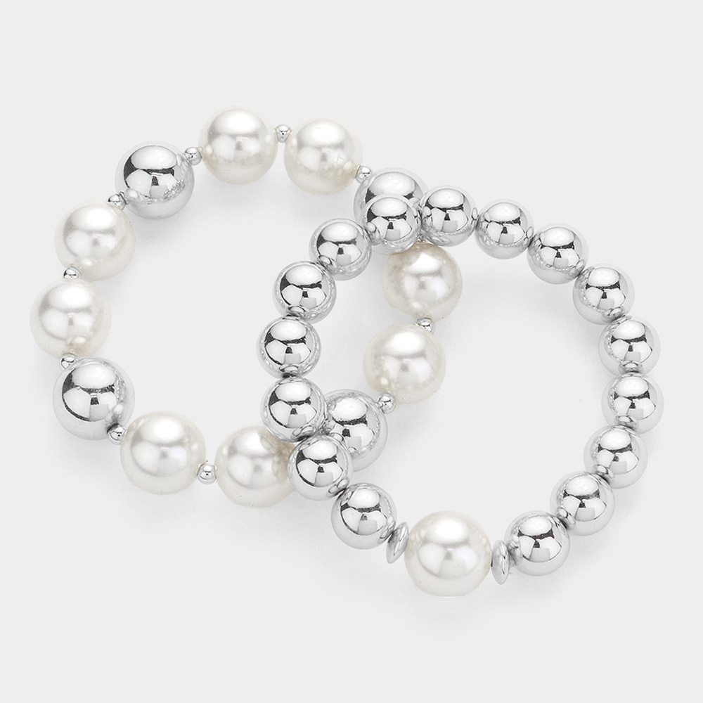 2PCS - Pearl Pointed Metal Ball Stretch Multi Layered Bracelets
