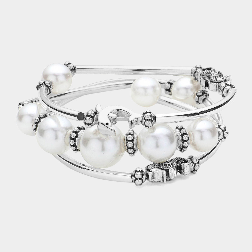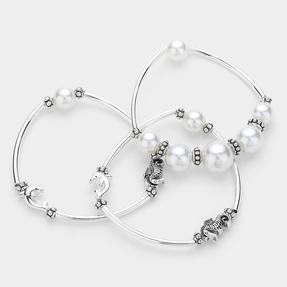 3PCS - Antique Silver Dolphin Sea Horse Pointed Pearl Stretch Multi Layered Bracelets