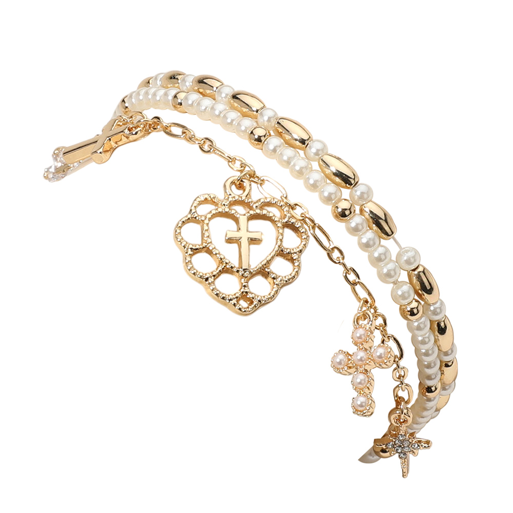 3PCS - Cross Charm Pearl Beaded Stretch Multi Layered Bracelets