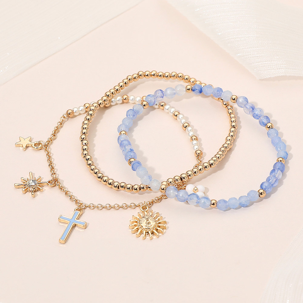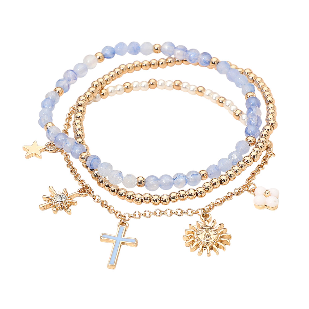 3PCS - Cross Flower Star Sunburst Charm Pearl Metal Ball Faceted Beaded Stretch Multi Layered Bracelets