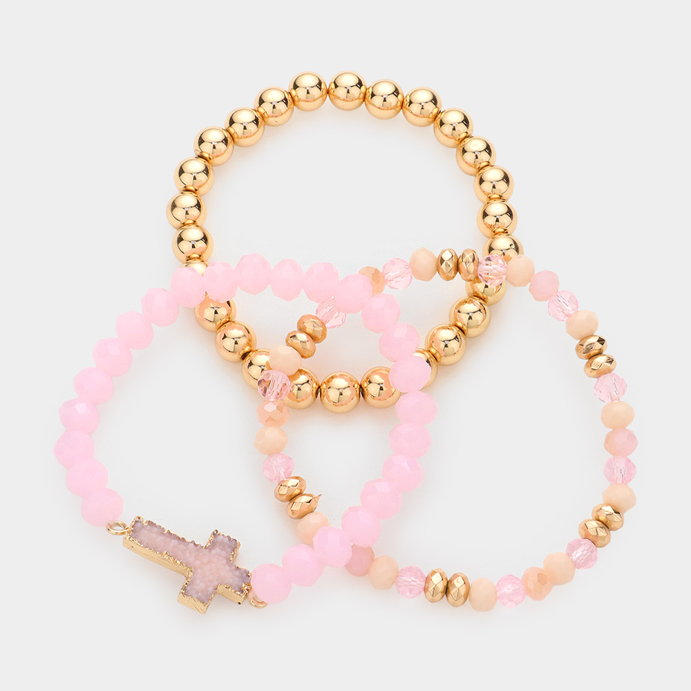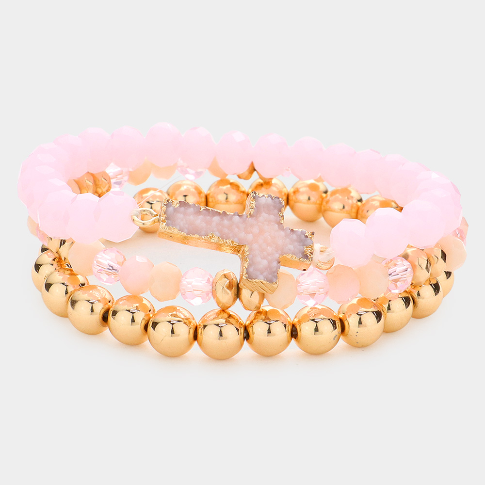 3PCS - Druzy Cross Accented Metal Ball Faceted Beaded Stretch Bracelets