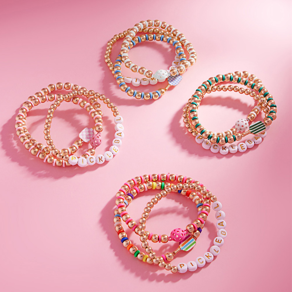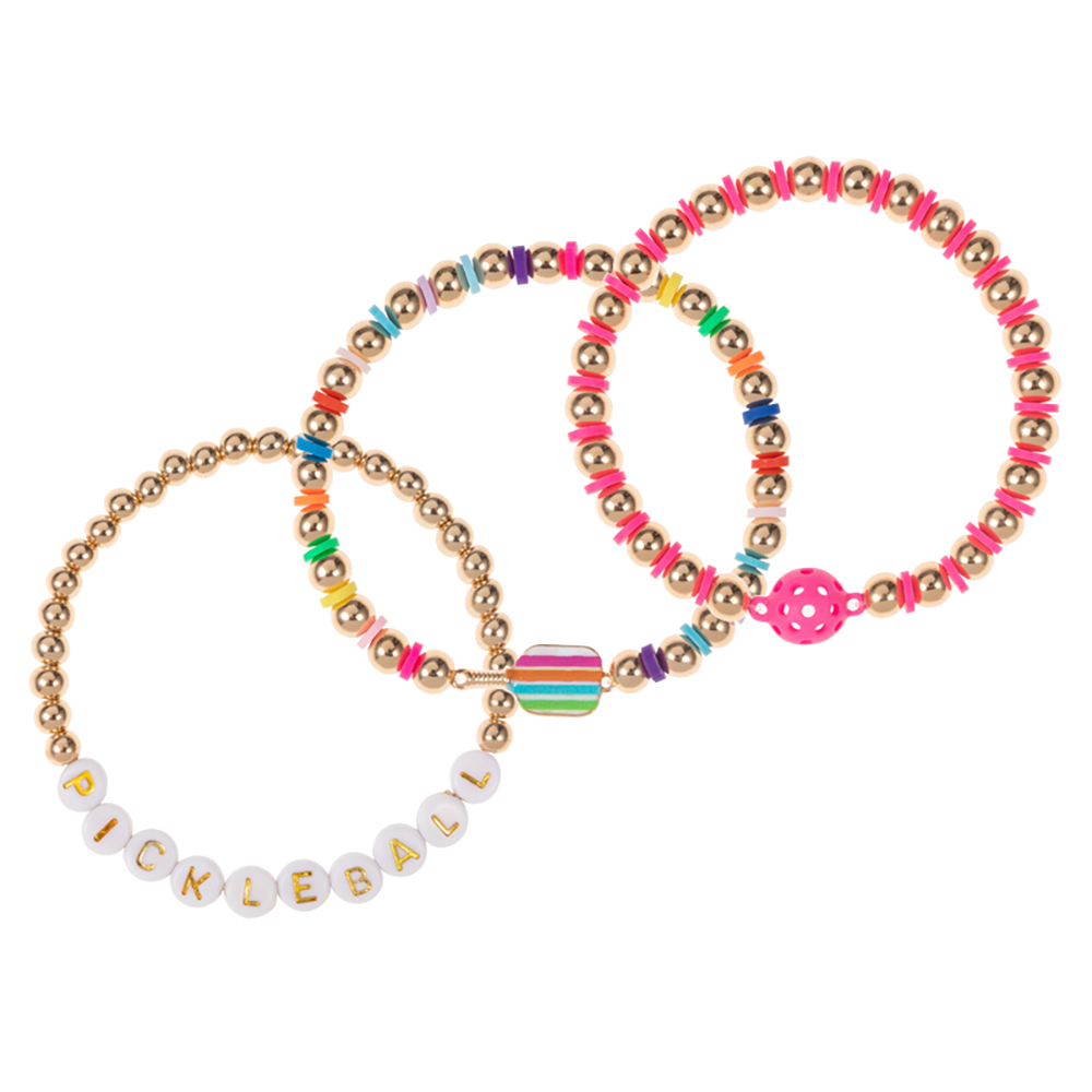Details • Size : 1" H • Stretchable • Stretch bracelet set featuring fun pickleball-themed charms, letter beads, and vibrant accents. A playful and sporty accessory ideal for fans, players, or anyone who loves the game and bold, casual style. • Lead and Nickel Compliant