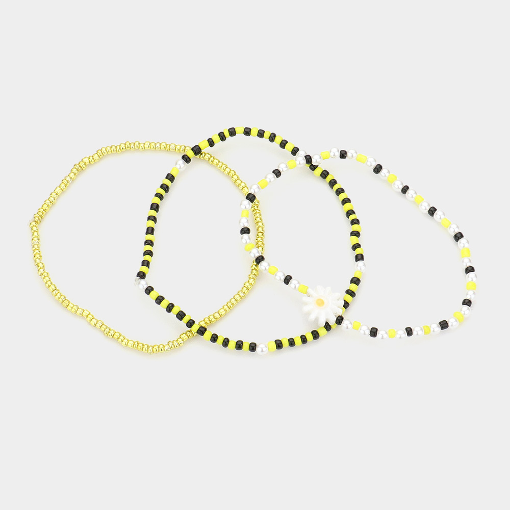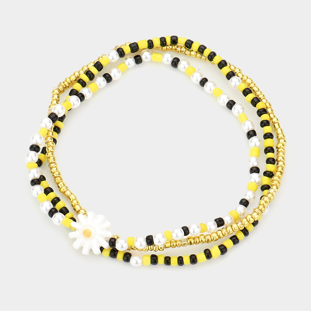 3PCS - Flower Accented Pearl Seed Beaded Stretch Bracelets