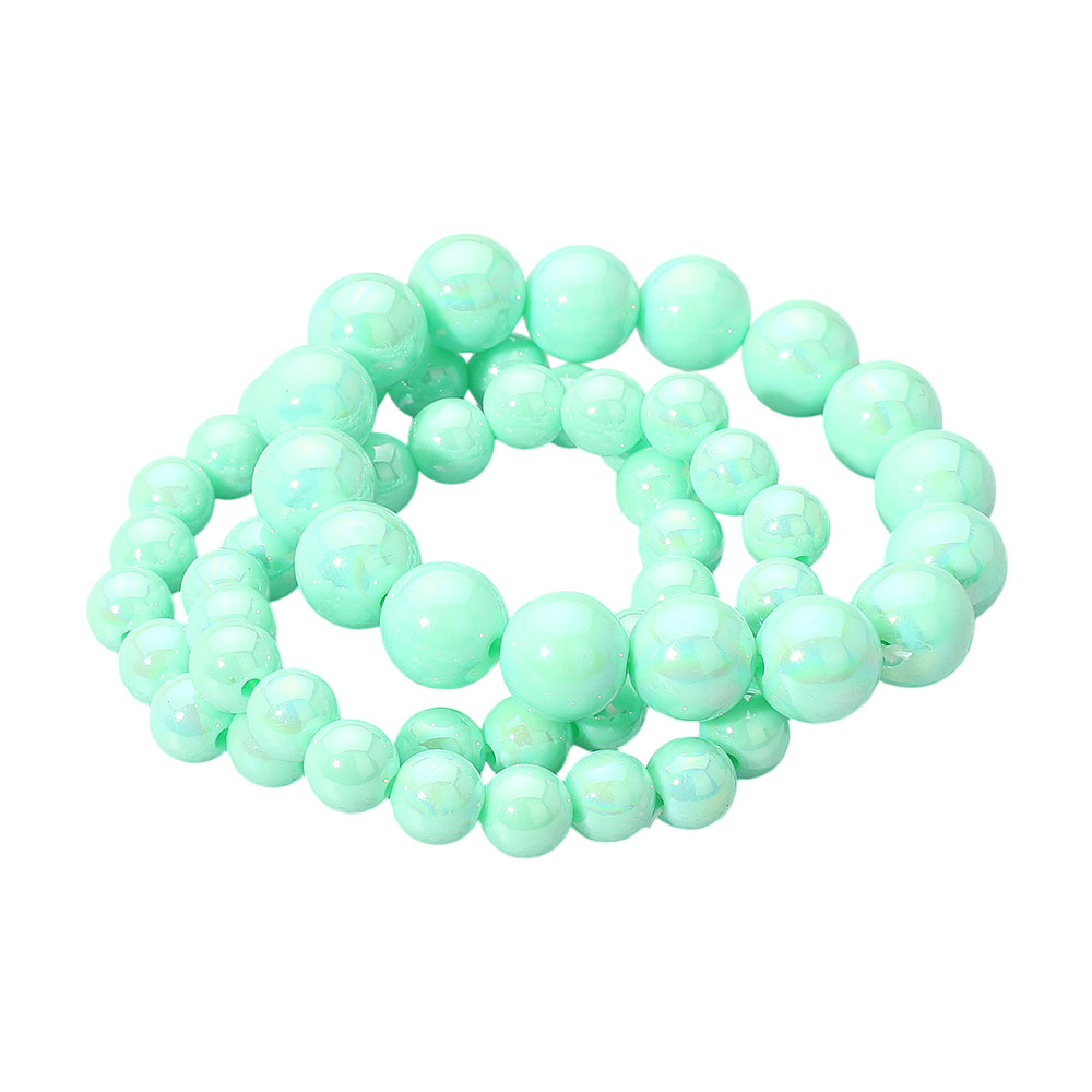 Details • Size : 1.25" H • Stretchable • Trio of stretch bracelets featuring glossy round beads in graduated sizes. These lightweight, stackable bracelets add a soft, polished finish to any outfit—ideal for everyday wear or layering styles. • Lead and Nickel Compliant