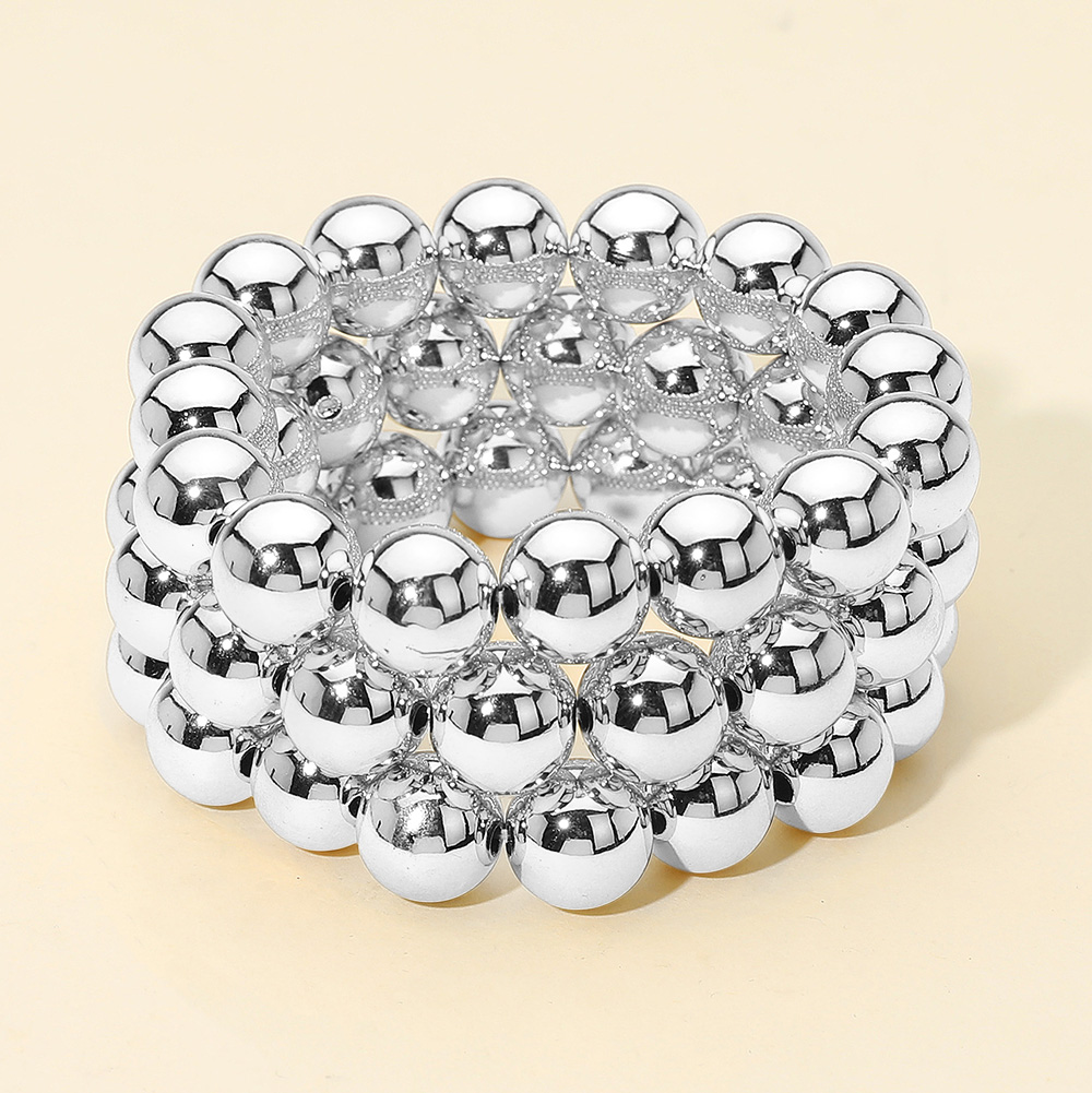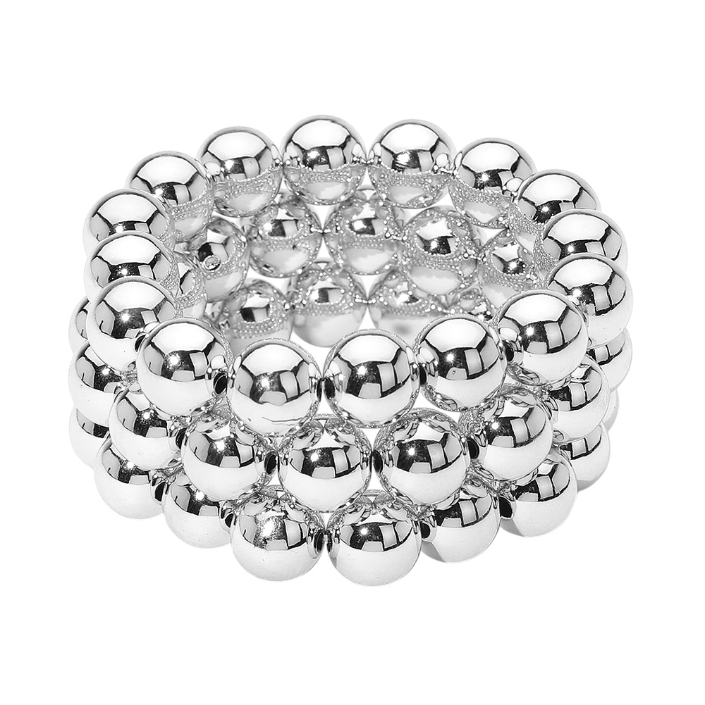 Details • Size : 1.25" H • Stretchable • Make a statement with this wide beaded stretch bracelet featuring multiple rows of polished spheres. Its bold yet versatile design adds a modern edge to casual and formal outfits, making it an essential accessory for effortless sophistication. • Lead and Nickel Compliant