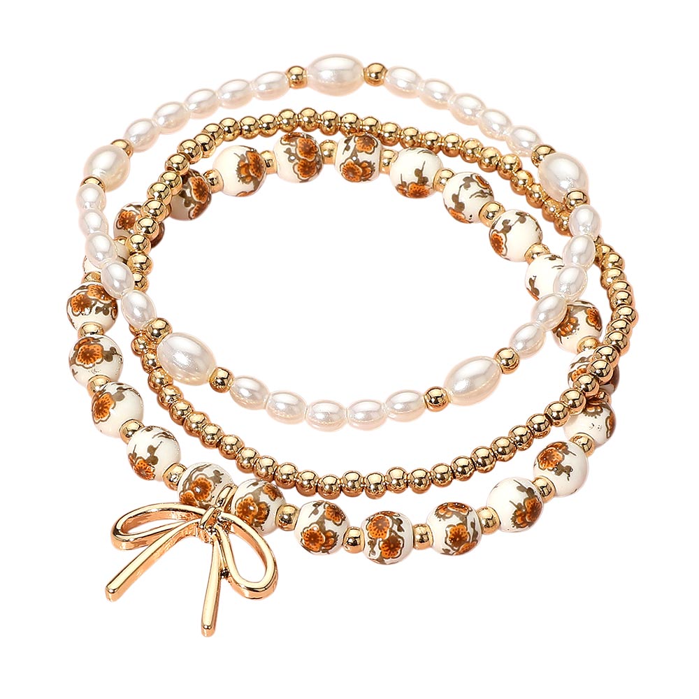 Details • Size : 1.25" H • Stretchable • Elegant 3-piece stretch bracelet set with floral-printed beads, metallic accents, and a dainty bow charm. Perfect for layering or wearing alone to add a touch of charm to your everyday or dressy outfits. • Lead and Nickel Compliant