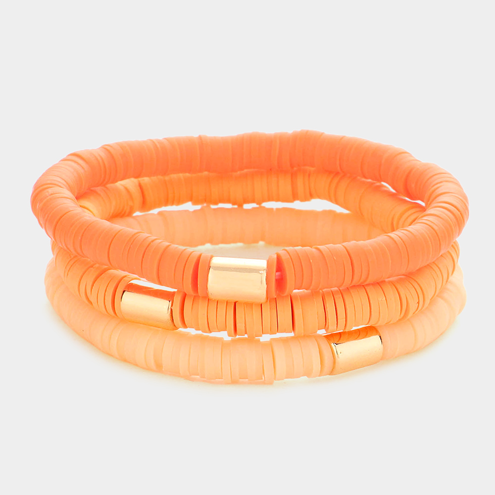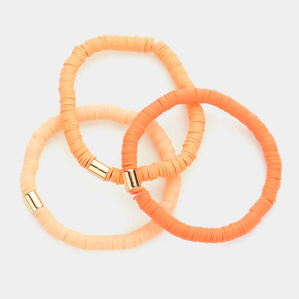 3PCS - Metal Cylinder Accented Heishi Beaded Stretch Bracelets