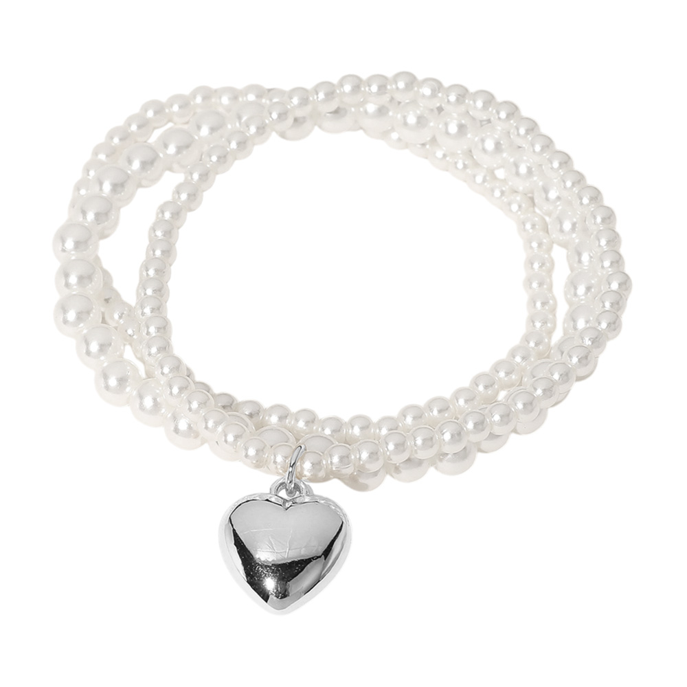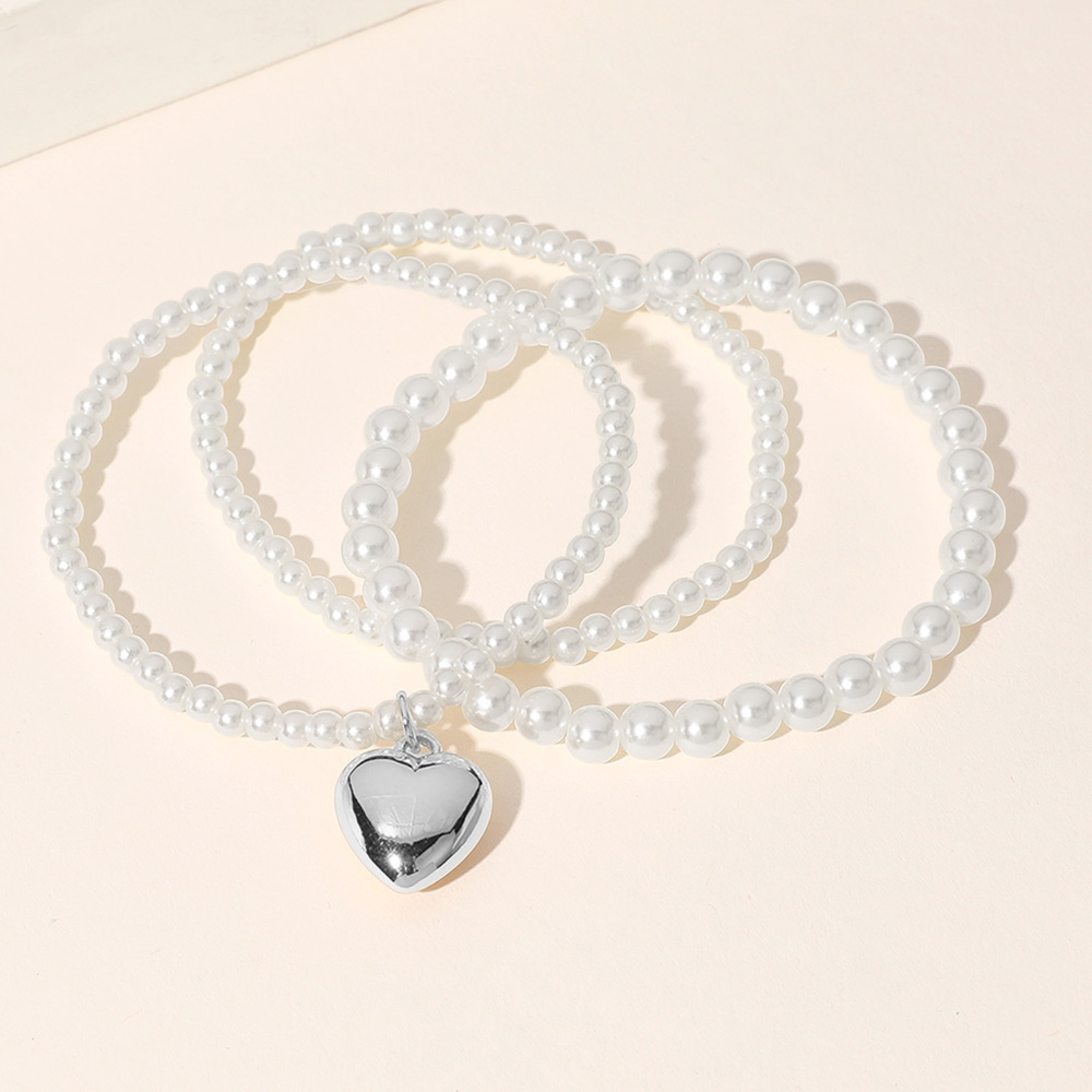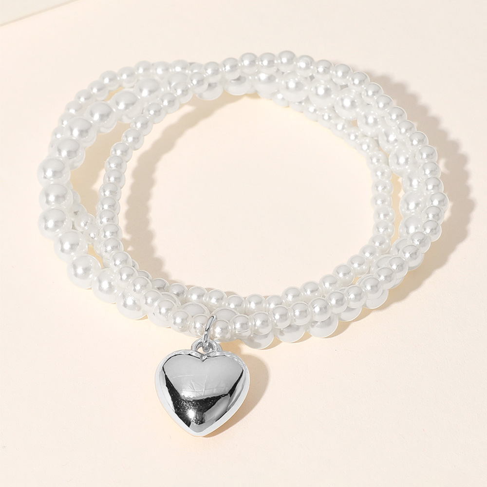 3PCS - Metal Heart Charm Pointed Pearl Beaded Stretch Multi Layered Bracelets