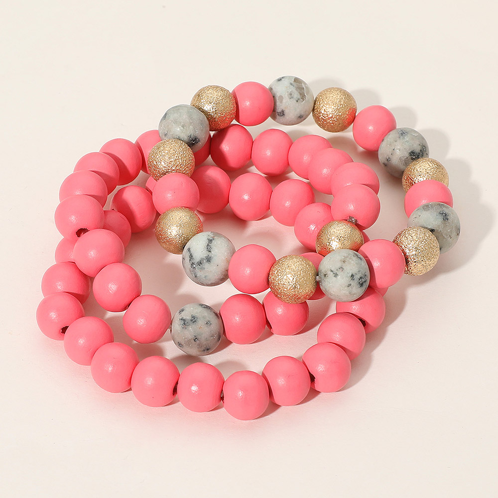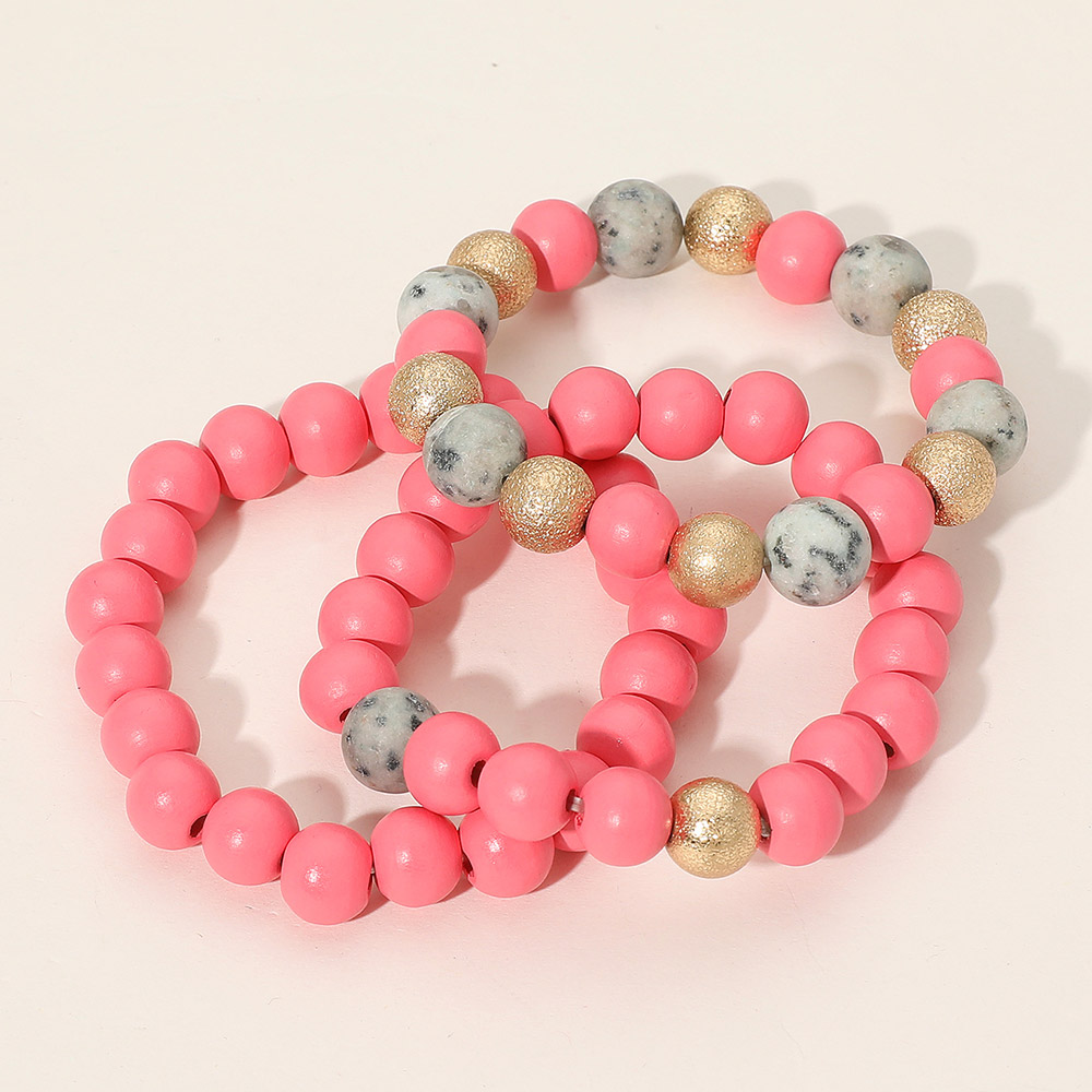 Details • Size : 1.25" H • Stretchable • Set of three stretch bracelets featuring smooth round beads, accented with marbled and shimmering textured beads. A stylish accessory that blends bold flair with a touch of elegance—perfect for stacking or wearing solo for a modern statement look. • Lead and Nickel Compliant