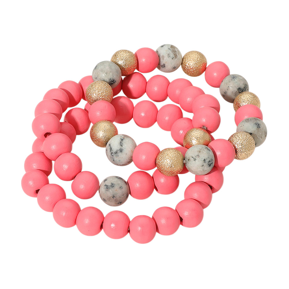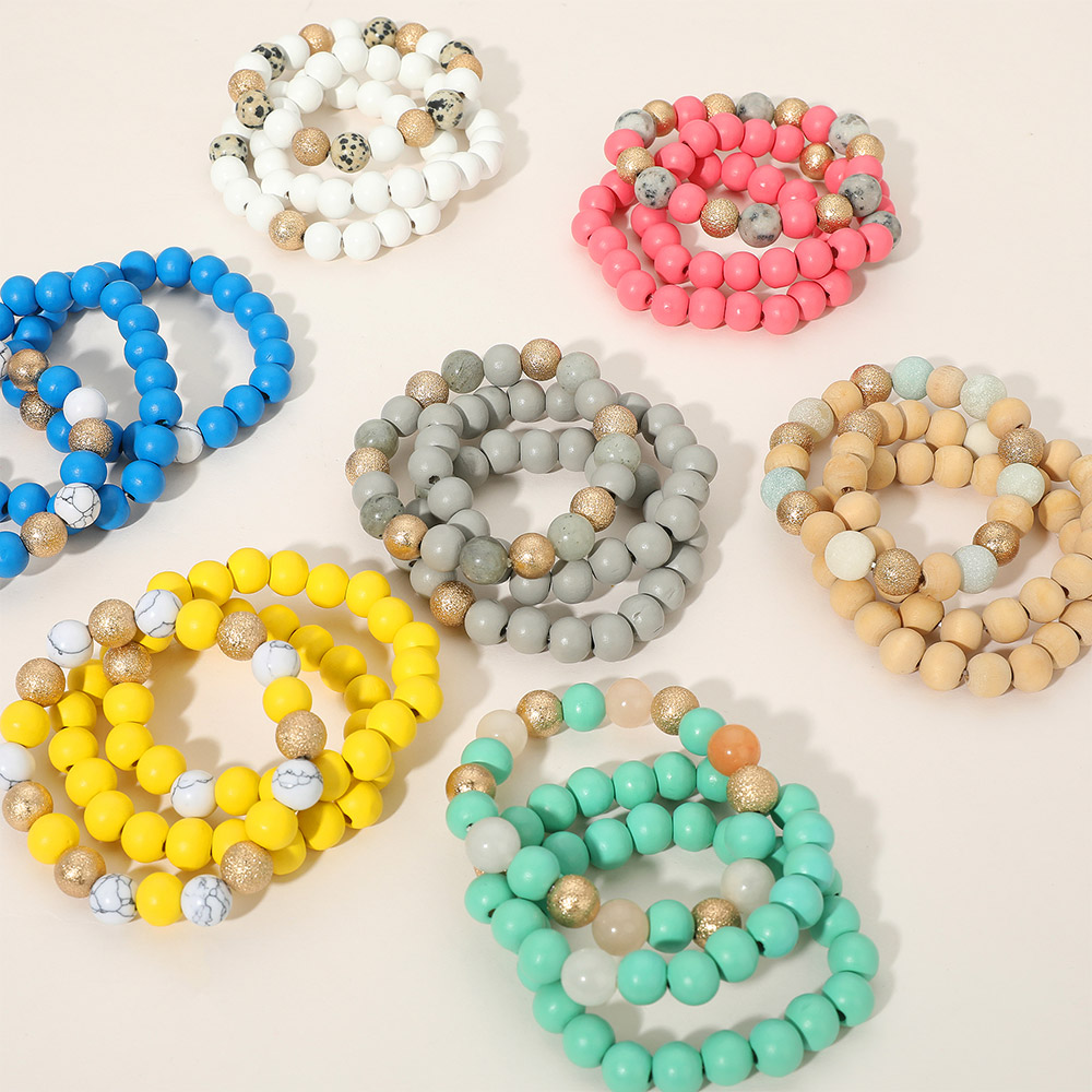 3PCS - Metal Natural Stone Wood Beaded Stretch Multi Layered Bracelets