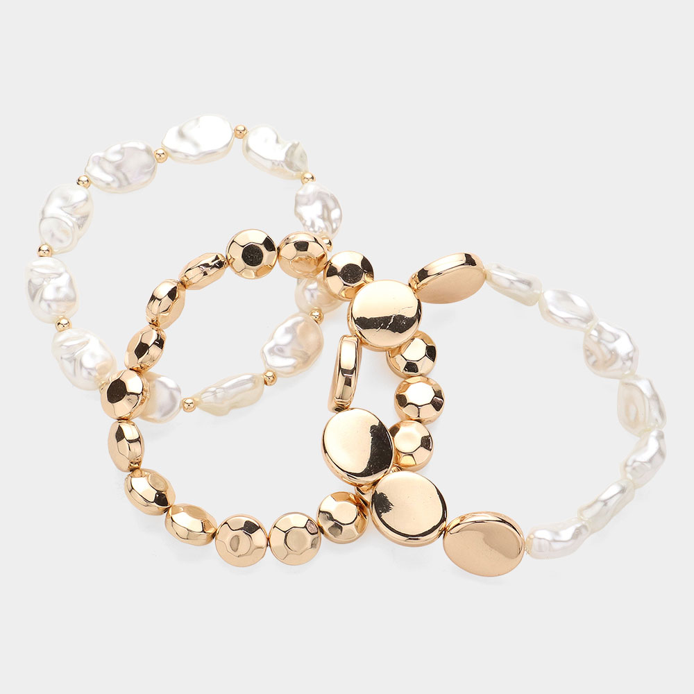 3PCS - Metal Pebble Pearl Beaded Stretch Multi Layered Bracelets