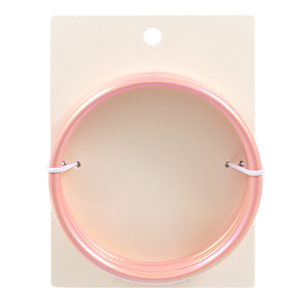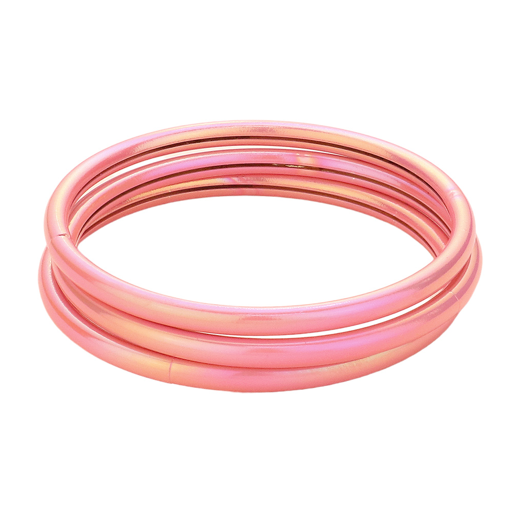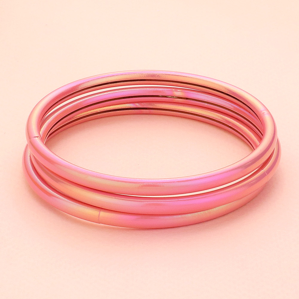 Details • Size : 0.6" H, 2.75" D • Elevate your accessories with this eye-catching set of three iridescent green bangles. Perfect for stacking or wearing solo, these sleek and stylish bracelets add a modern shimmer to any outfit with ease. • Lead and Nickel Compliant