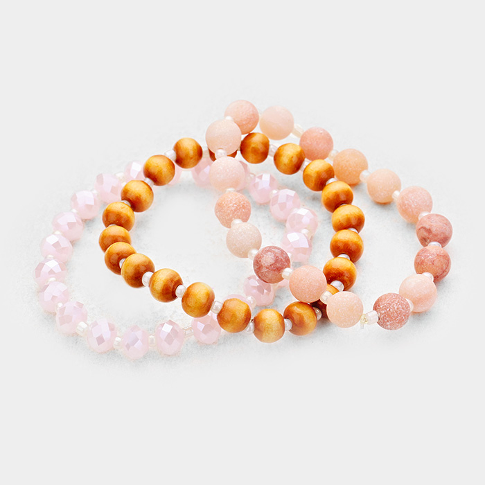 3PCS Multi Strand Wood Natural Stone Bead Stretch Bracelets
