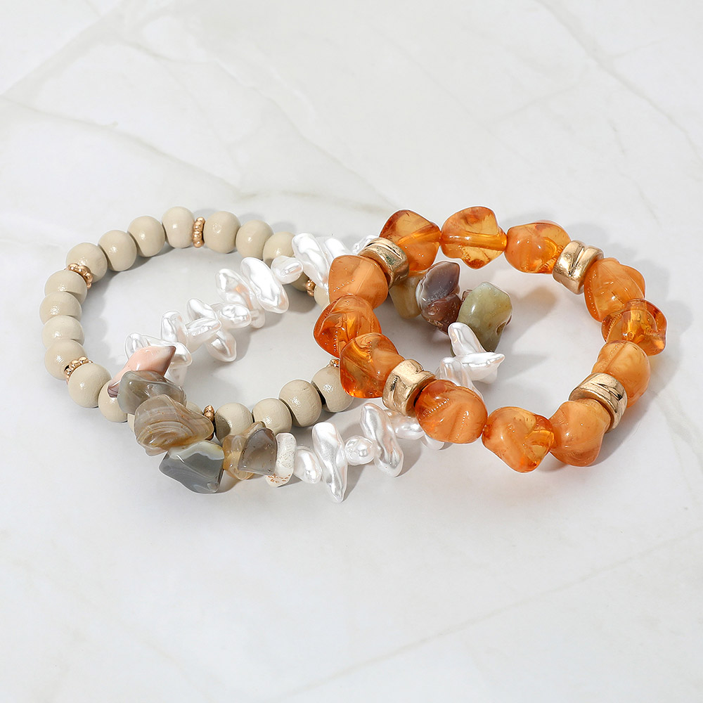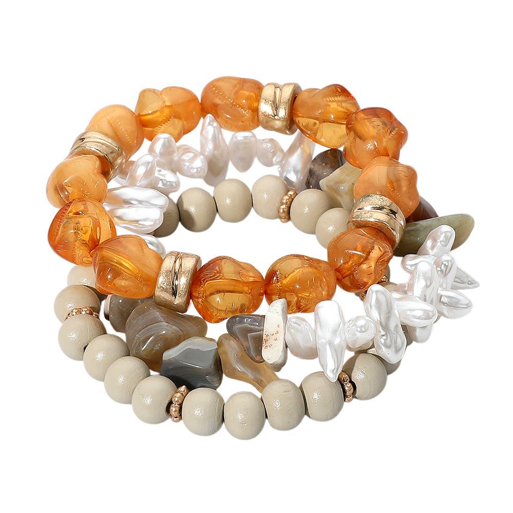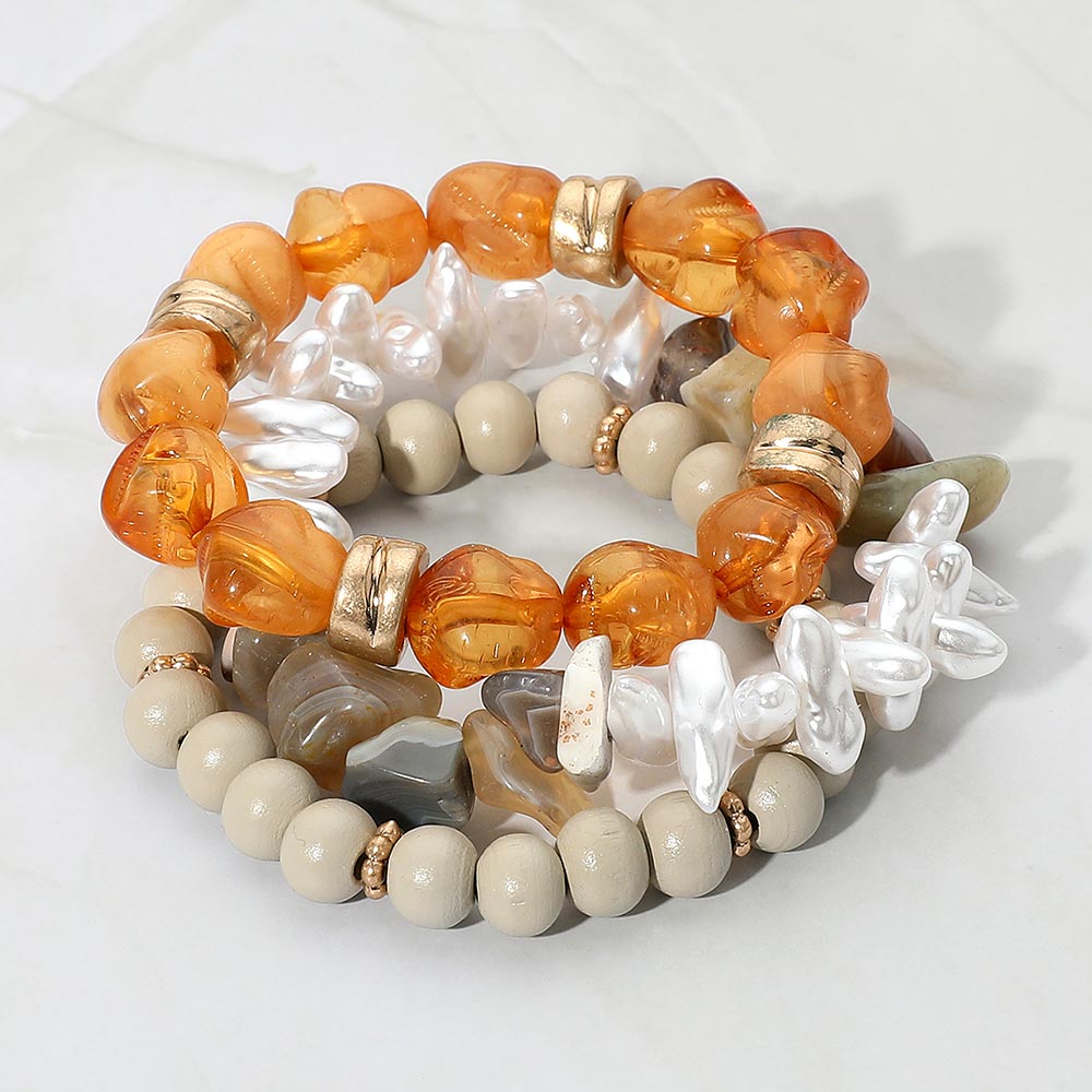 Details • Size : 1.25" H • Stretchable • Three-piece stretch bracelet set featuring natural stones, irregular beads, and wooden accents. A unique blend of organic shapes and textures, perfect for adding a natural touch to any casual or boho-inspired outfit. • Lead and Nickel Compliant
