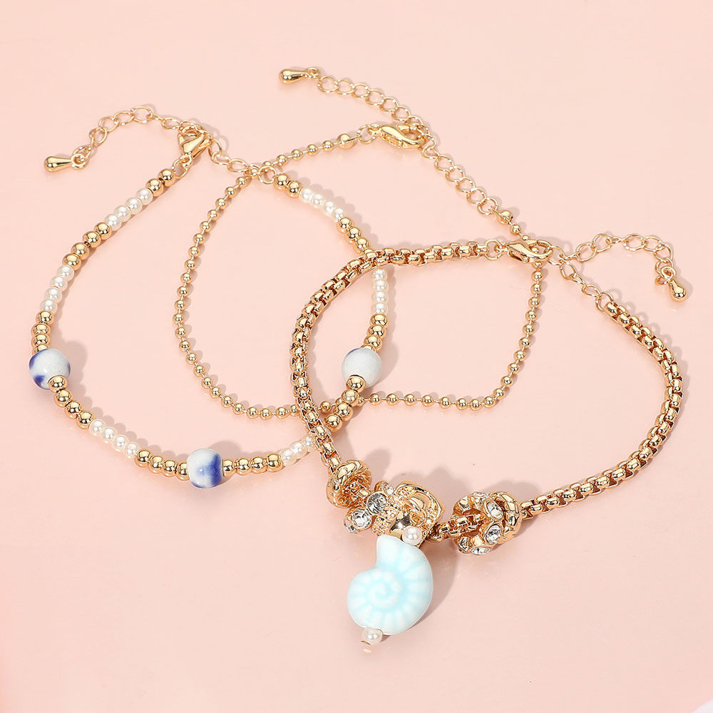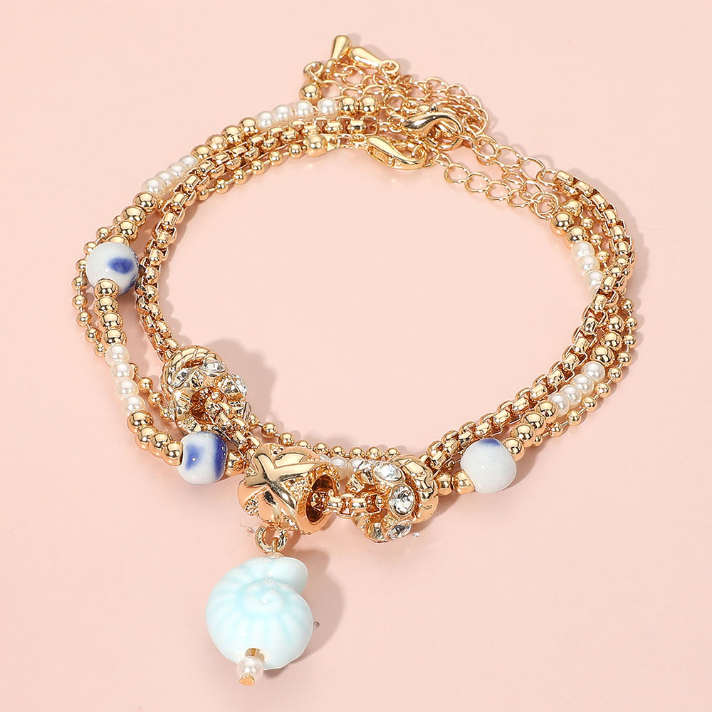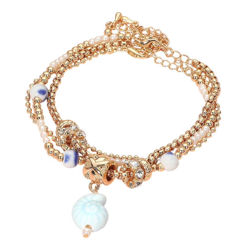 3PCS - Nautical Ceramic Shell Charm Accent Pearl Crystal Metal Beaded Multi Layered Bracelets