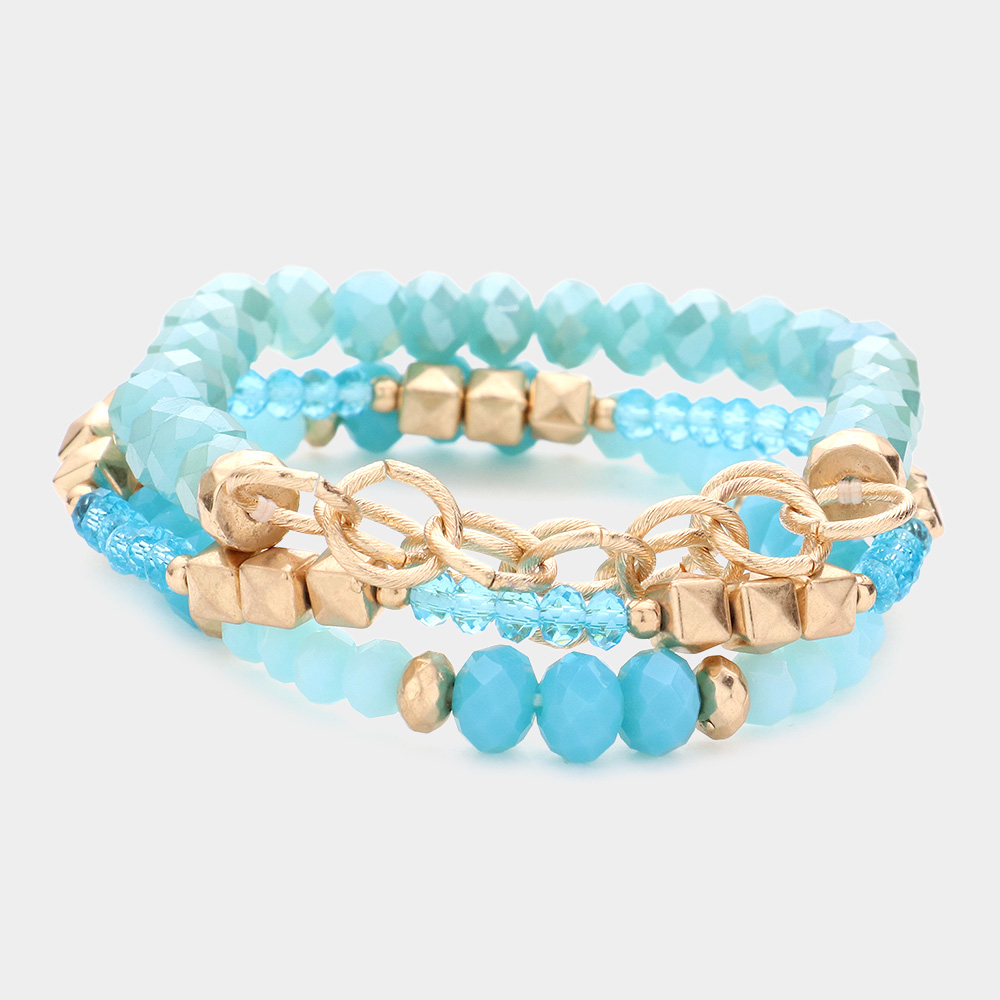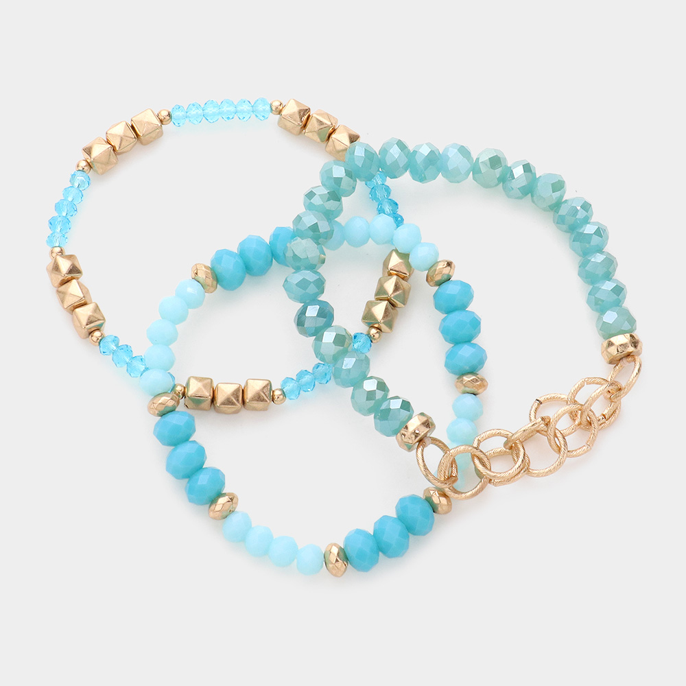 3PCS - Open Circle Link Metal Cube Faceted Beaded Stretch Bracelets