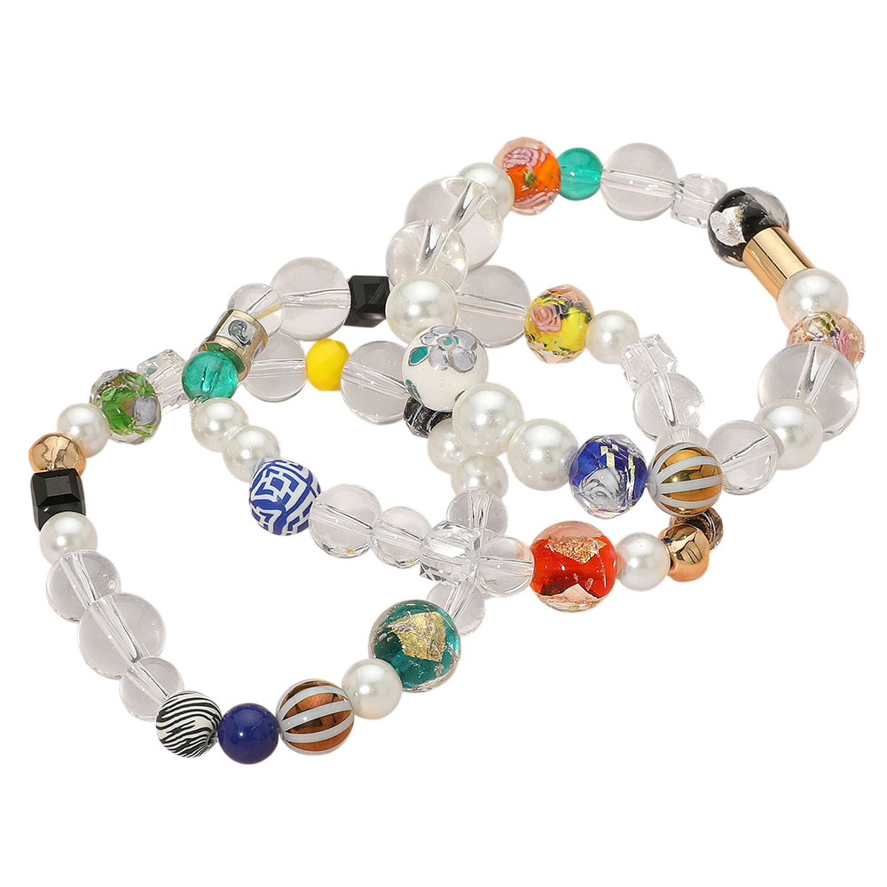 3PCS - Patterned Bead Accented Pearl Clear Lucite Ball Stretch Bracelets