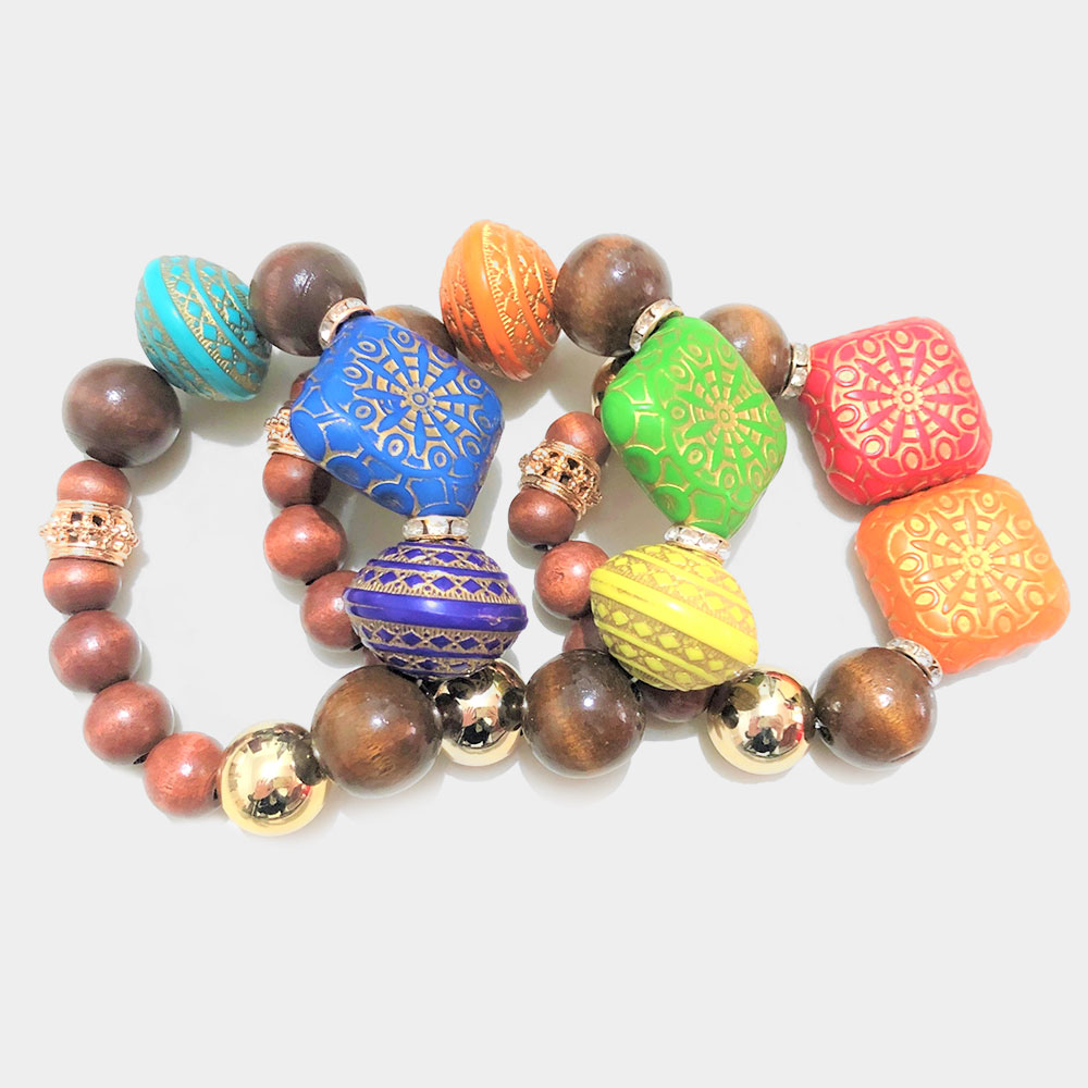 3PCS - Patterned Colorful Wood Accented Stretch Bracelets