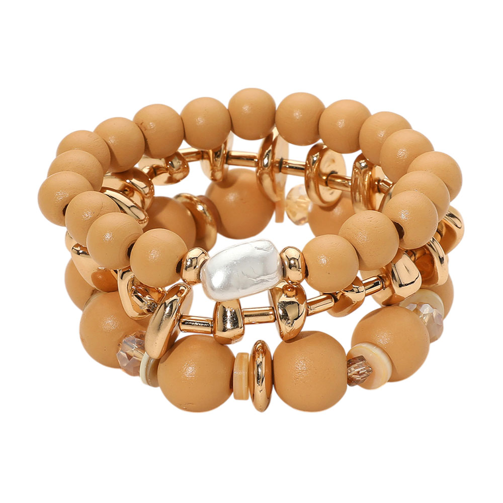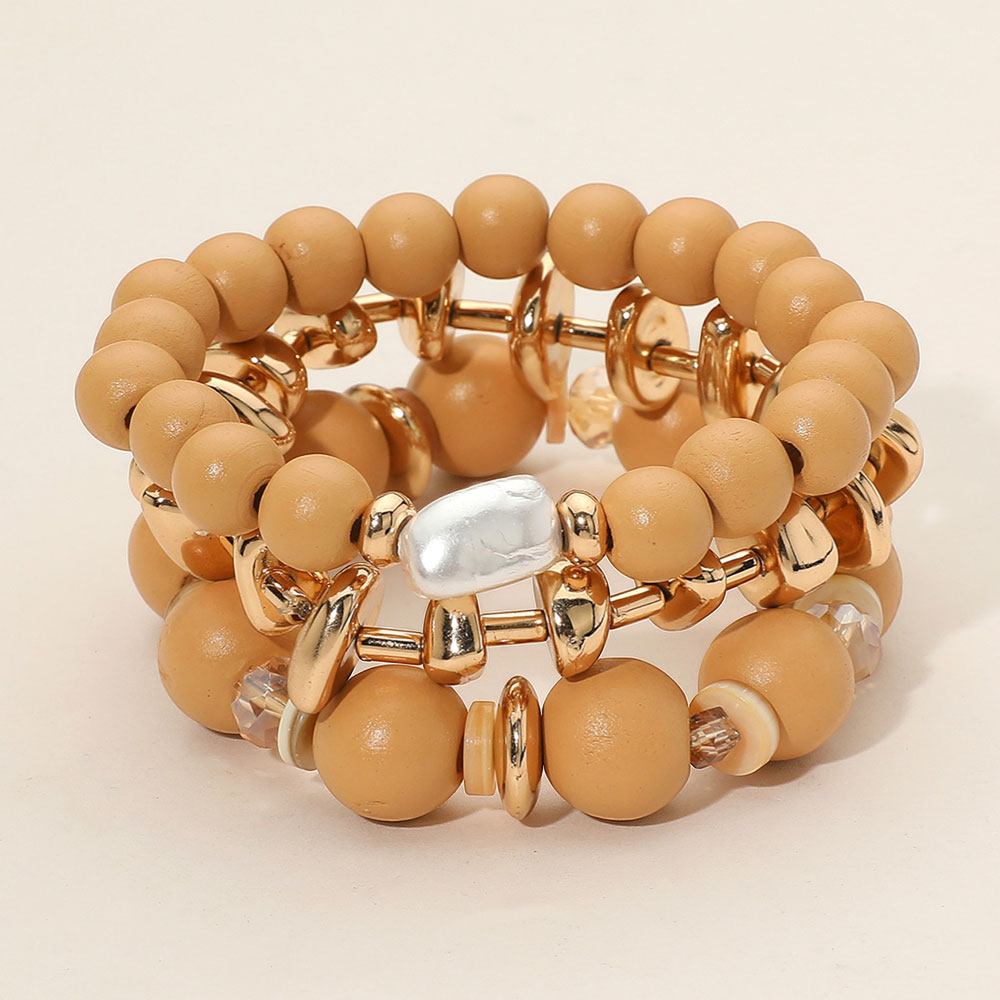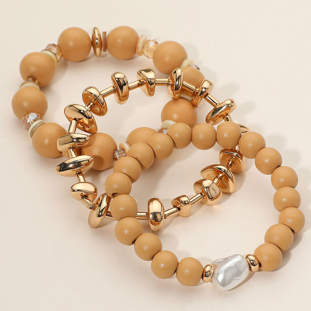 3PCS - Pearl Accent Metal Wooden Ball Beaded Stretch Multi Layered Bracelets