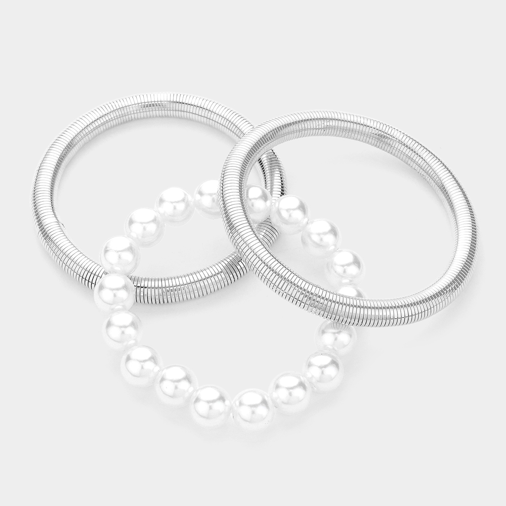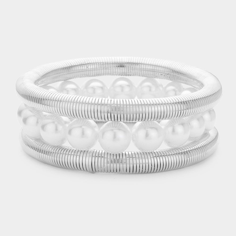3PCS - Pearl Beaded Metal Cable Multi Layered Stretch Bracelets