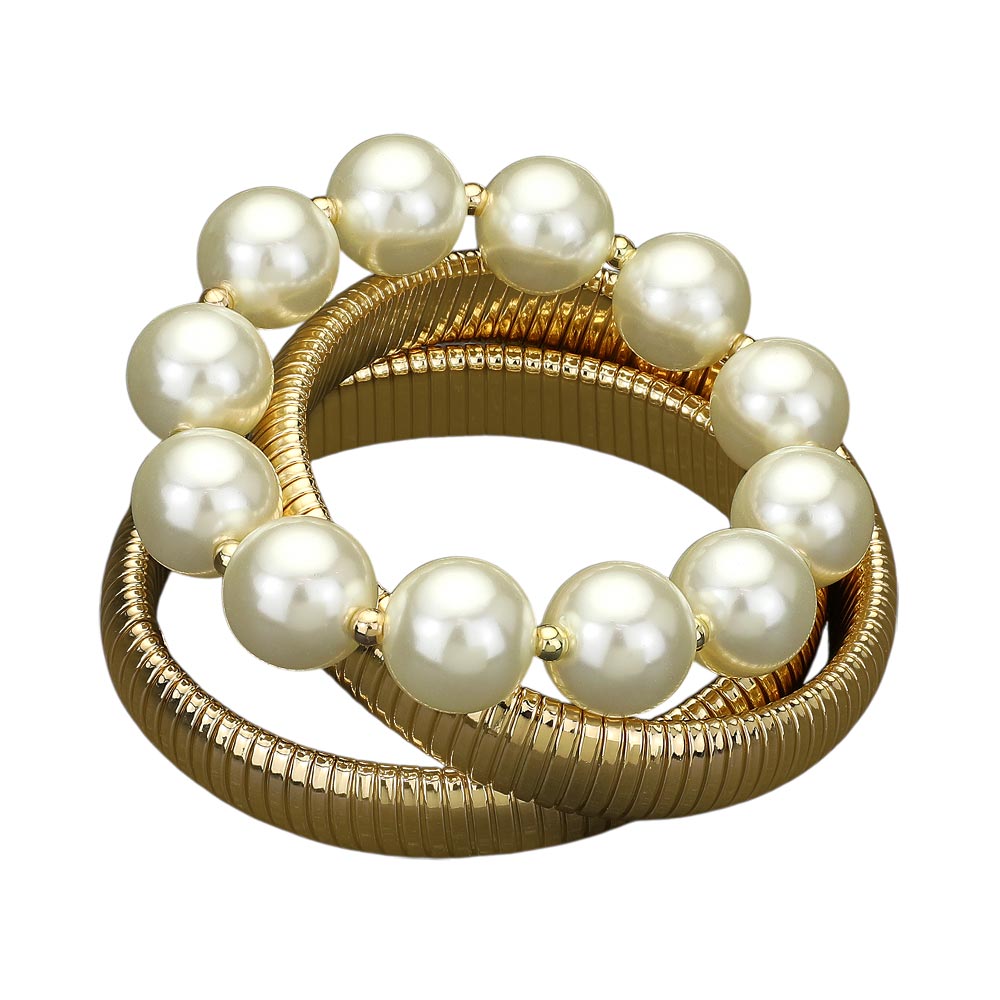 Details • Size : 1.75" H • Stretchable • Enhance your jewelry collection with this pearl and metallic stretch bracelet set, featuring luminous pearls paired with sleek metallic bands. Designed for comfort and style, this versatile bracelet set transitions effortlessly from casual outfits to formal occasions with timeless sophistication. • Lead and Nickel Compliant