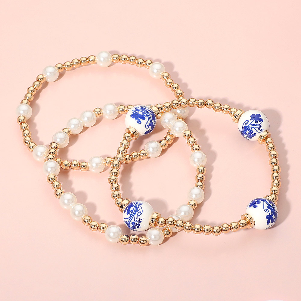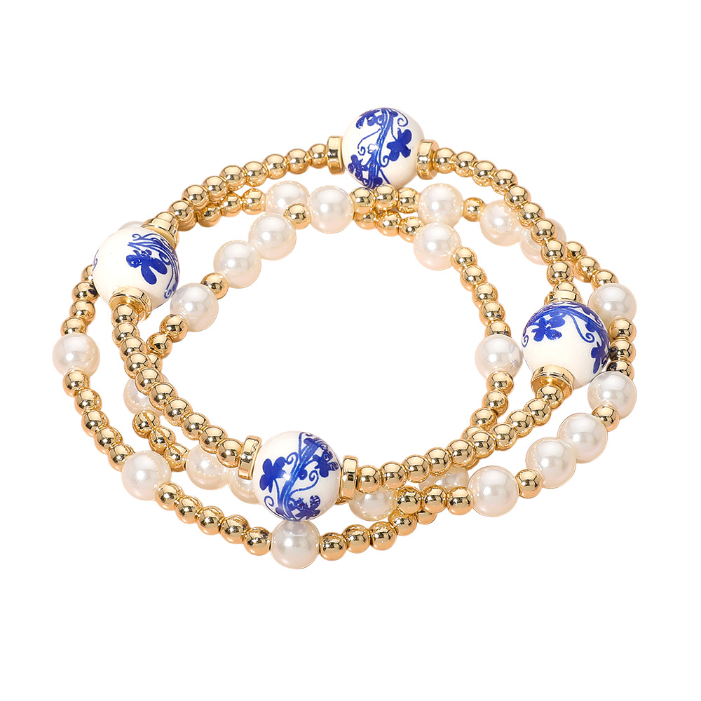Details • Size : 1" H • Stretchable • Elegant bracelet set featuring a mix of polished metallic and faux pearl beads, accented by round porcelain-style beads with intricate floral detailing. This versatile 3-piece set offers a sophisticated layered look perfect for any occasion. • Lead and Nickel Compliant
