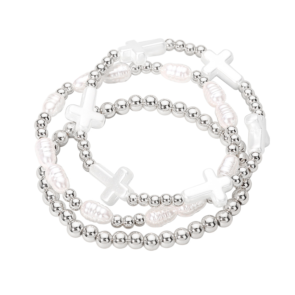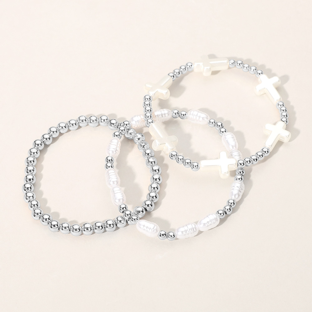 3PCS - Pearl Cross Metal Ball Beaded Stretch Multi Layered Bracelets