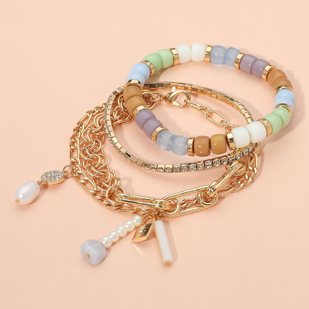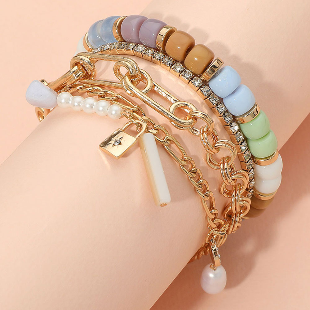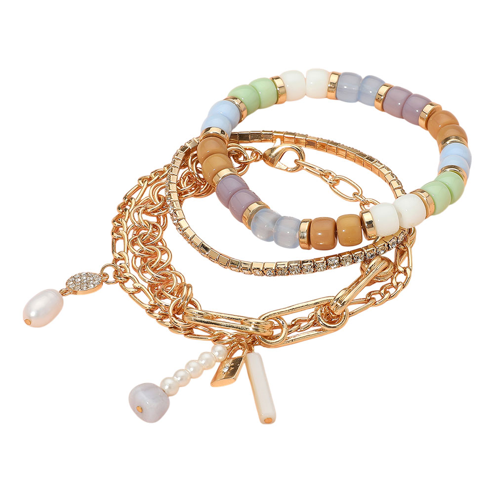 • Chic multi-strand bracelet set combining chain links, faceted beads, and dangling charms. A versatile accessory perfect for casual or dressy looks.