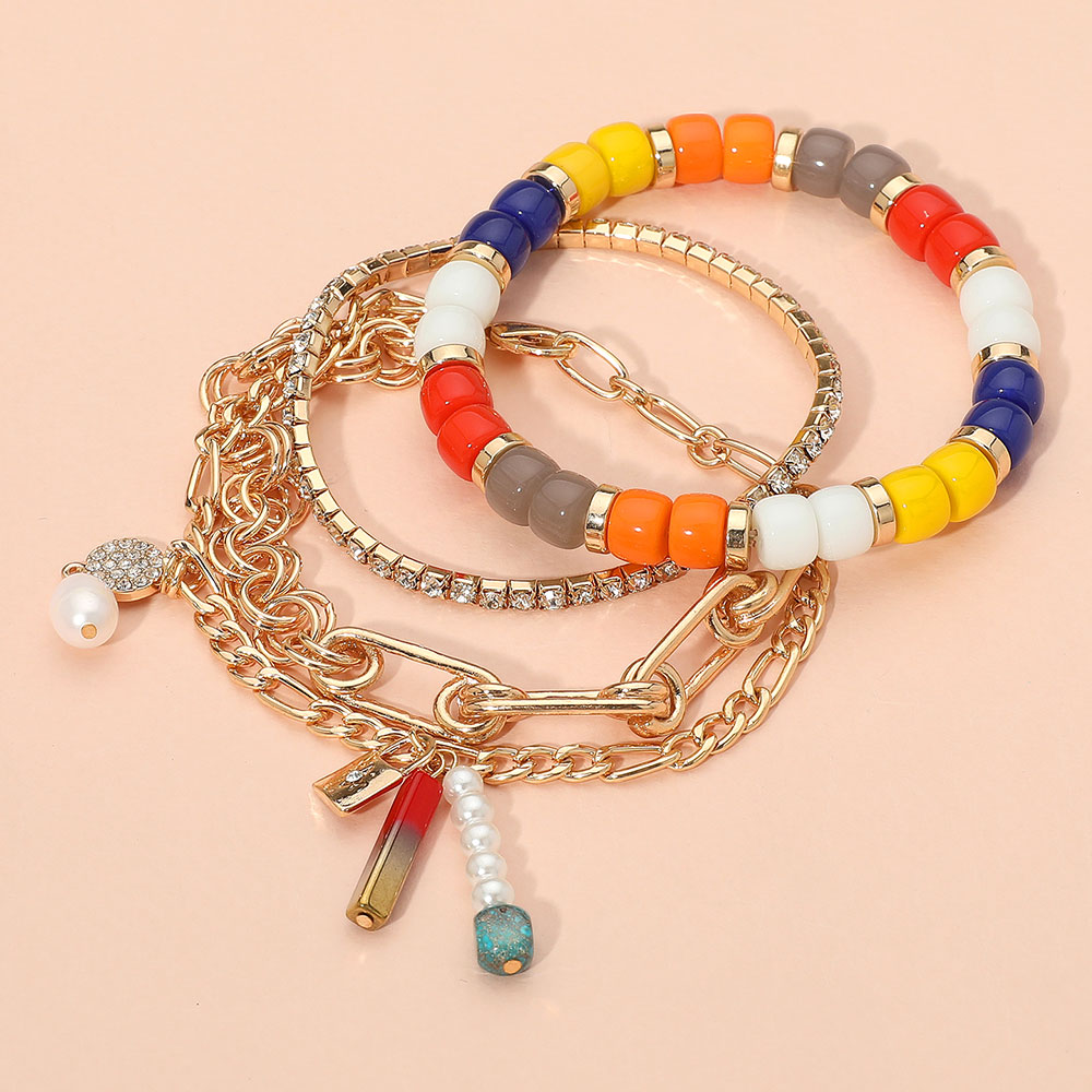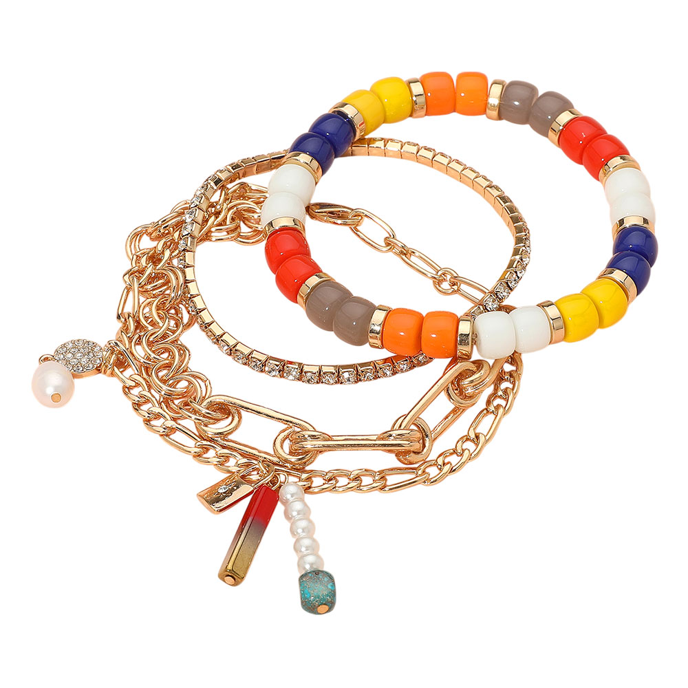 • Chic multi-strand bracelet set combining chain links, faceted beads, and dangling charms. A versatile accessory perfect for casual or dressy looks.