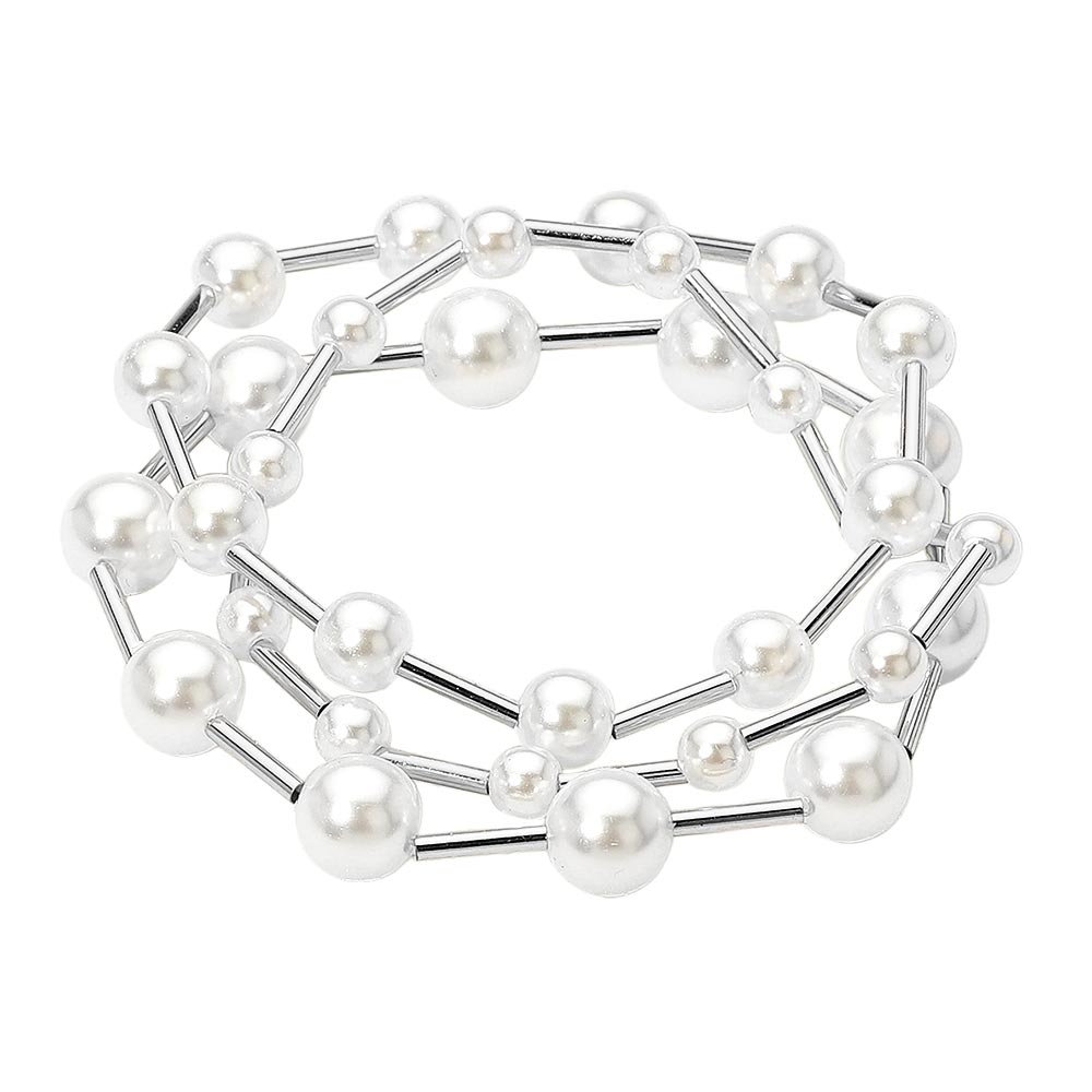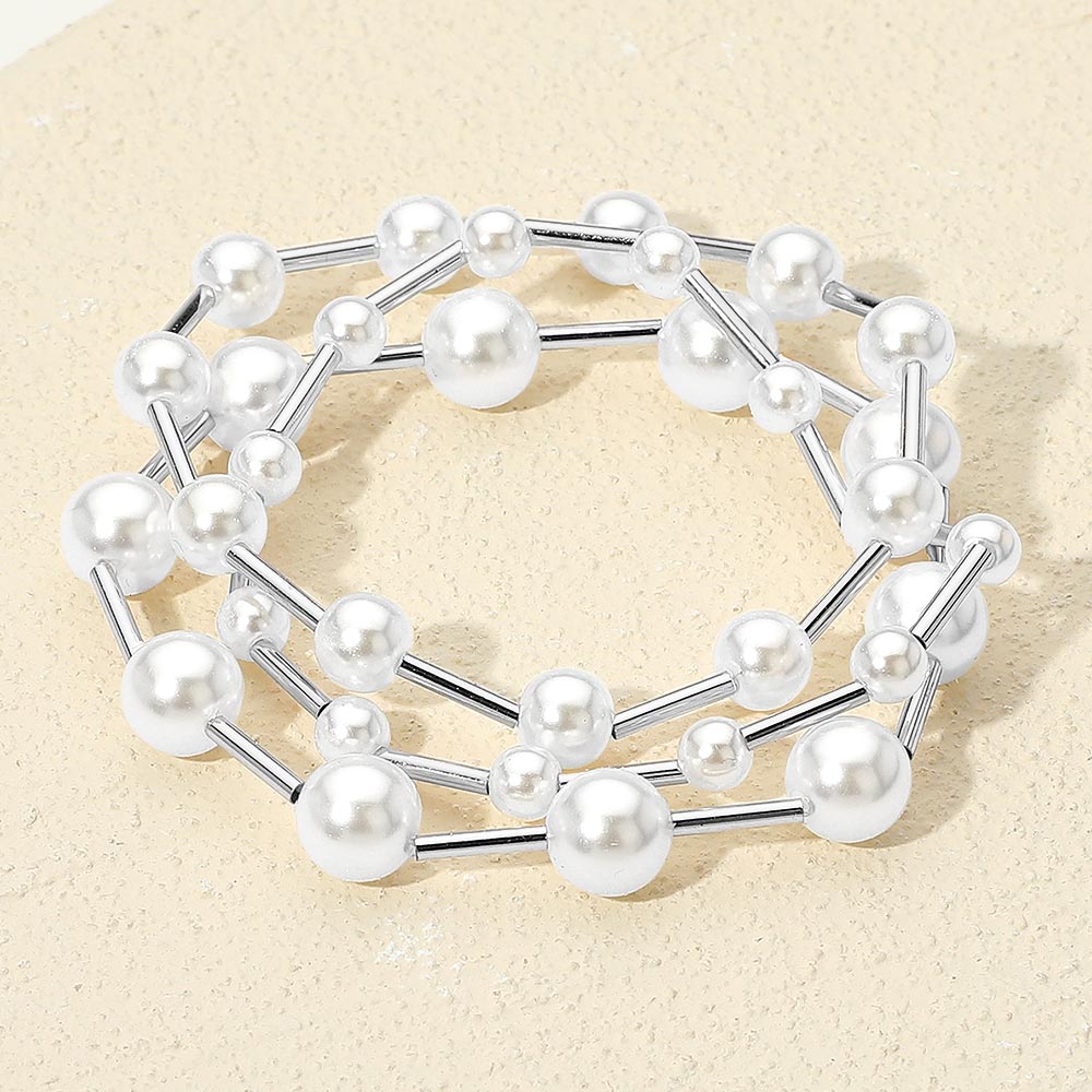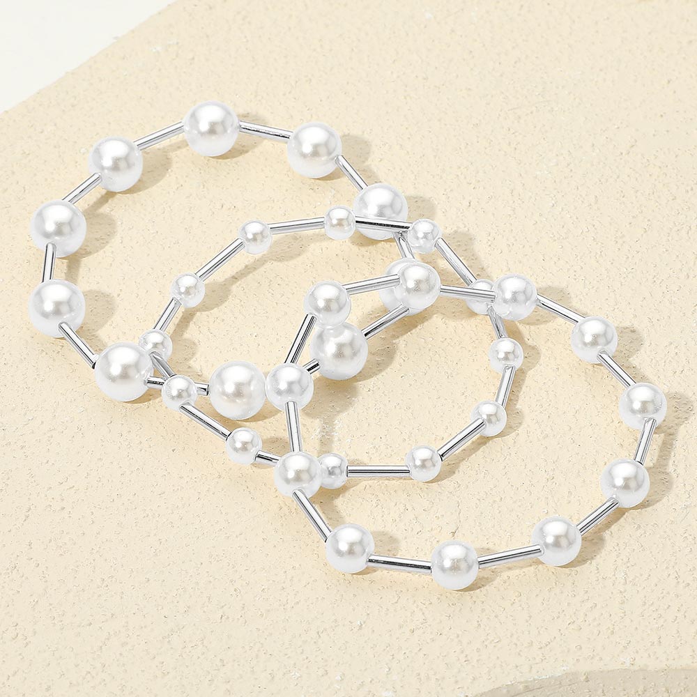 3PCS - Pearl Metal Bar Beaded Stretch Multi Layered Bracelets