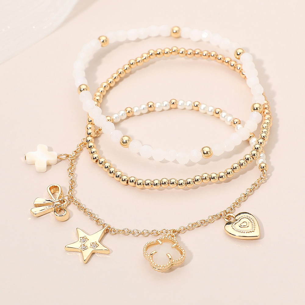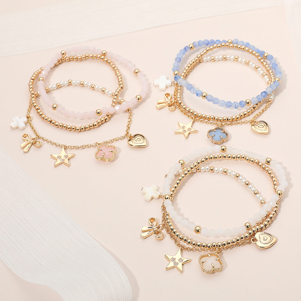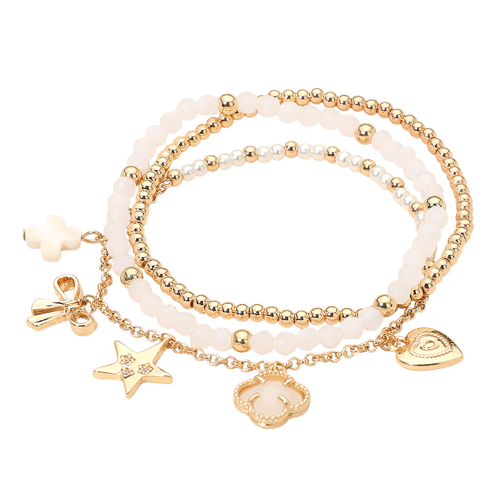 3PCS - Quatrefoil Bow Heart Cross Charm Pearl Metal Ball Faceted Beaded Stretch Multi Layered Bracelets